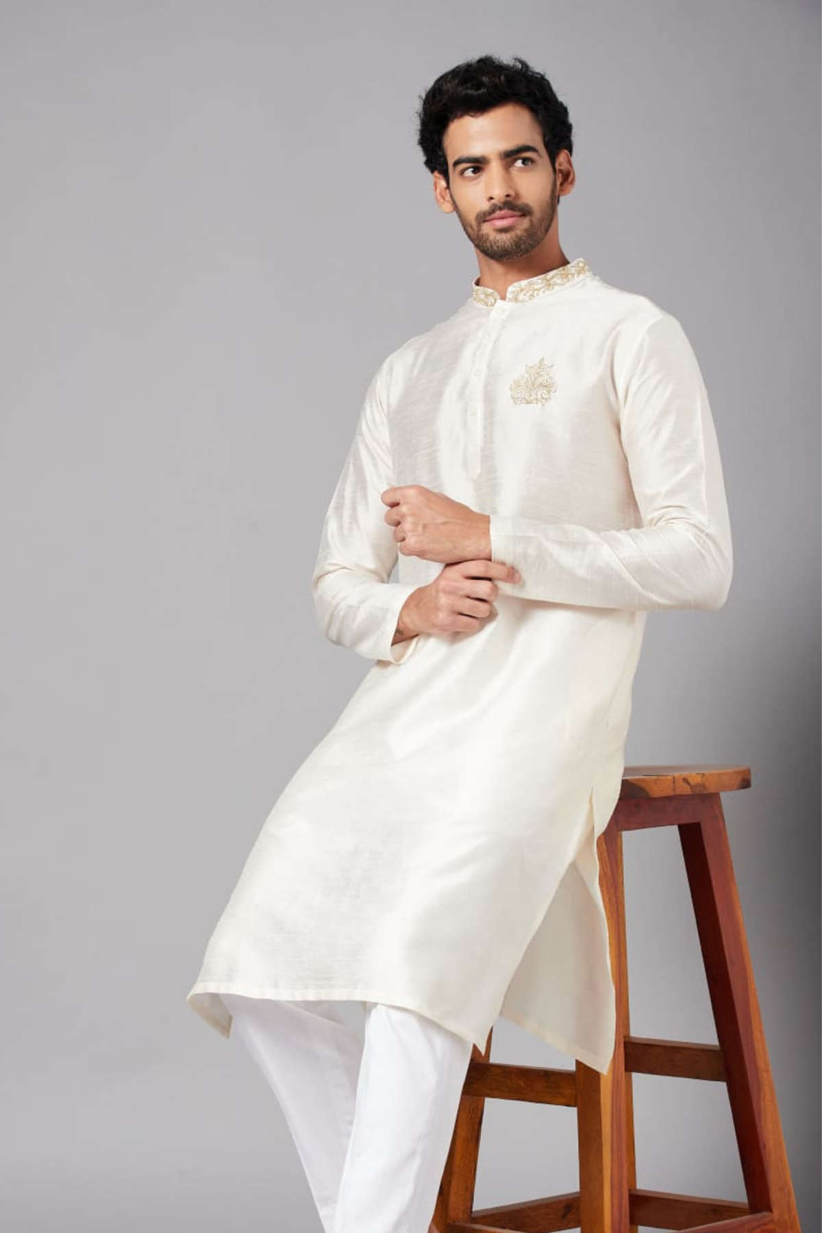 Product Details: We love minimalism. This white embroidered kurta is one of our favorites. We guarantee some jaw dropping looks people will give you.Simple, elegant plain colored kurta. Made from PS silk fabric. It has machine embroidery near the collar & sleeves. This kurta also has a small motif on the chest. This can be paired with a off-white pants or white trousers