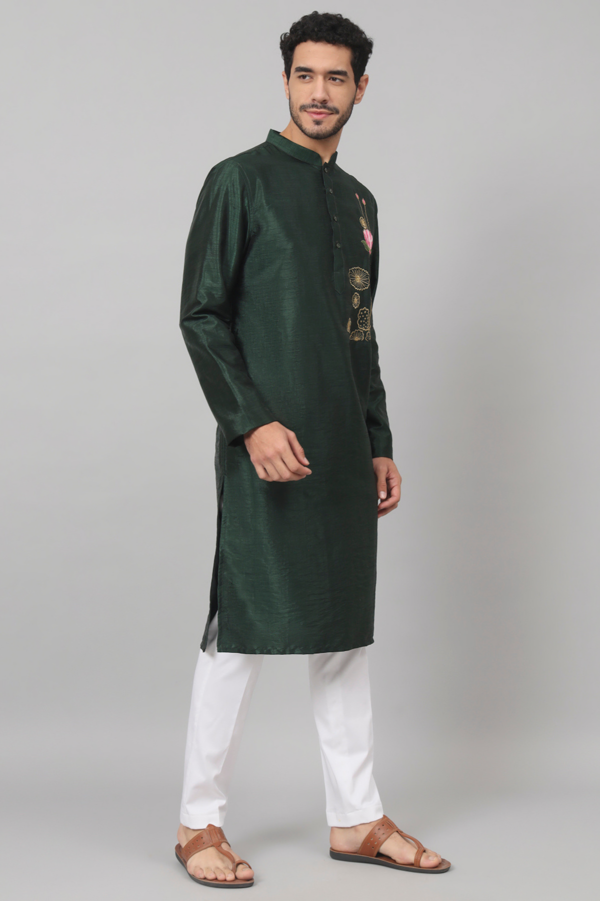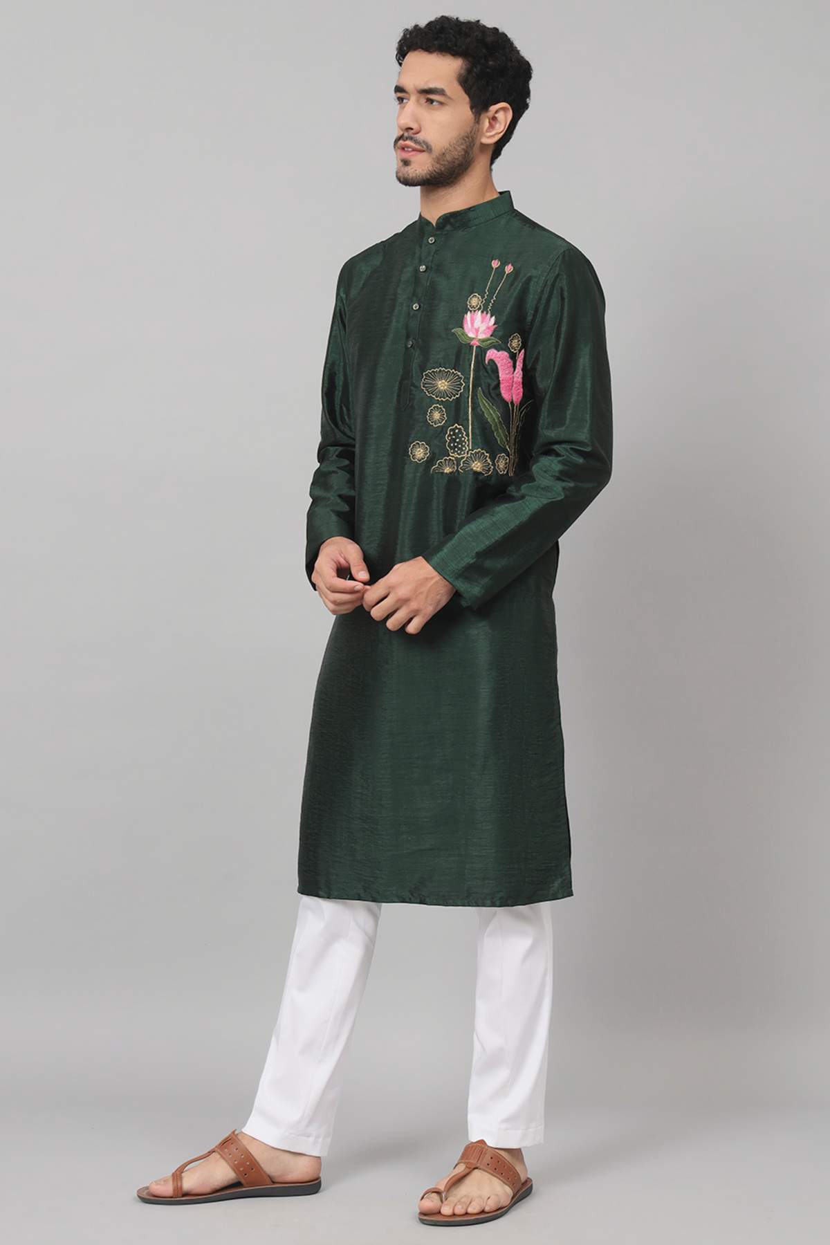 Introducing Green Kurta adorned with a fusion of nature's beauty and refined style. The serene lavender hue serves as a serene backdrop, perfectly complementing the intricate detailing of the embroidery. Each branch tells a story of delicate artistry, creating a captivating narrative of nature's grace and timeless charm. Perfect for those seeking a unique blend of elegance and natural inspiration, this kurta effortlessly embodies the essence of serene and cultural richness.