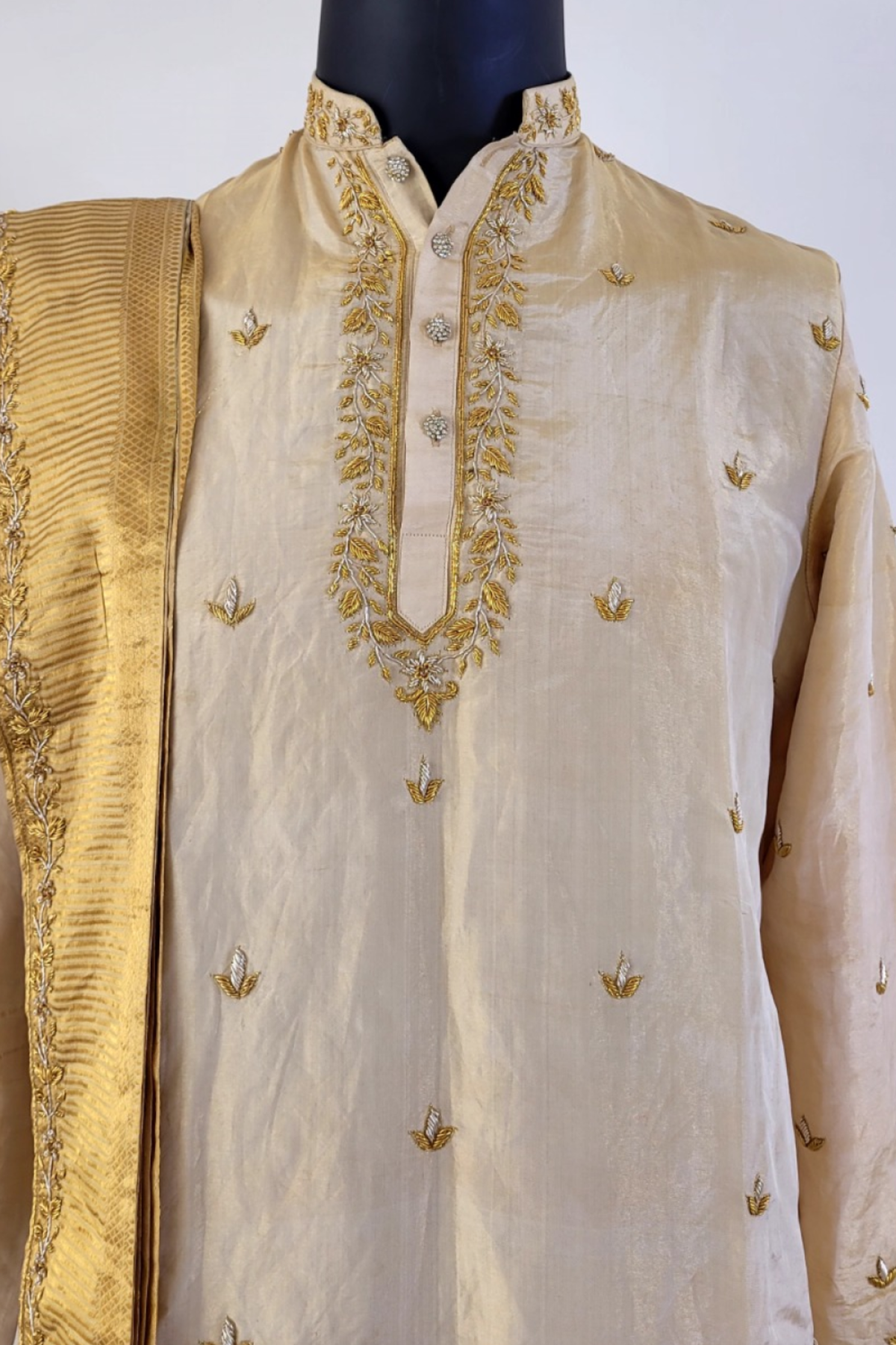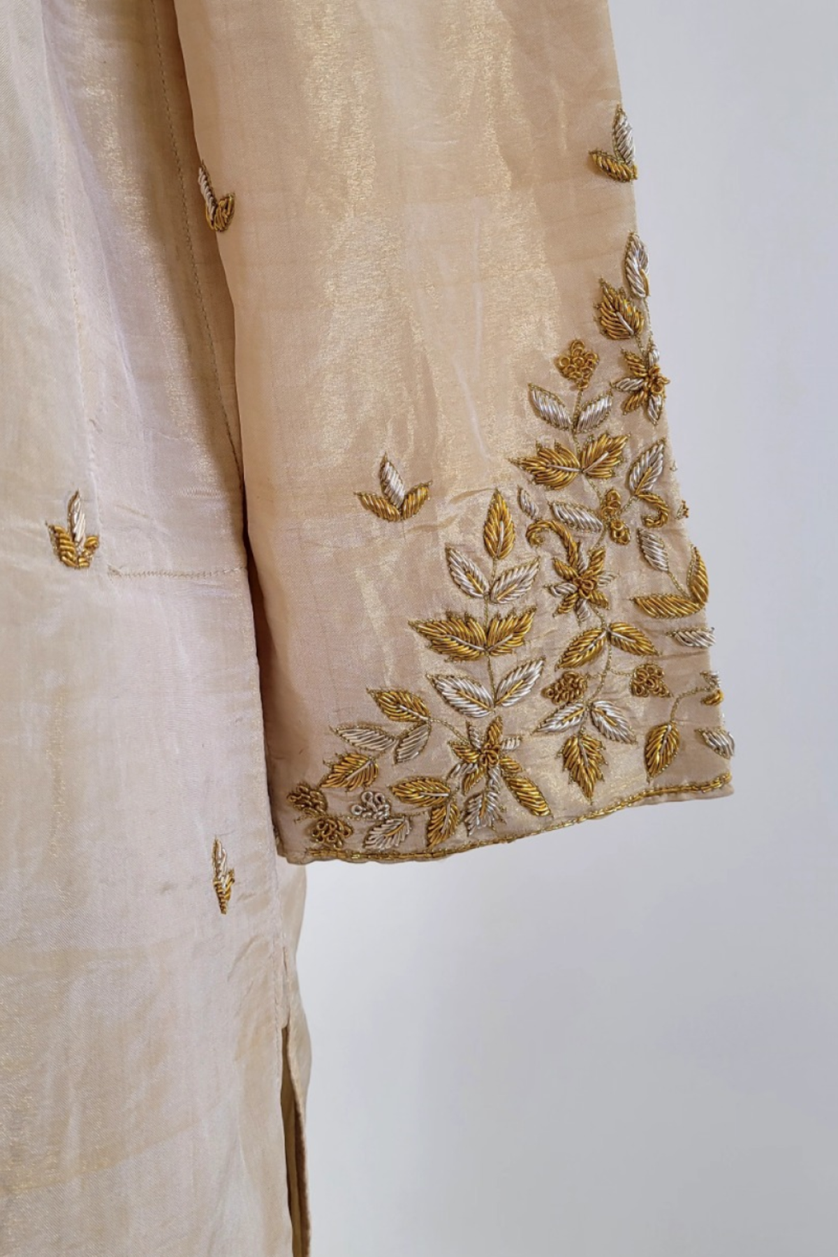 Enhance your allure with the Pattu kurta set. A light gold tissue is paired with dhoti featuring a lavish gold hand-embroidered border. Intricate detailing at the neckline with dark gold hand embroidery along with V shape cuff embroidery , embellished with elaborate gold work and all-over buta , exudes exquisite charm.