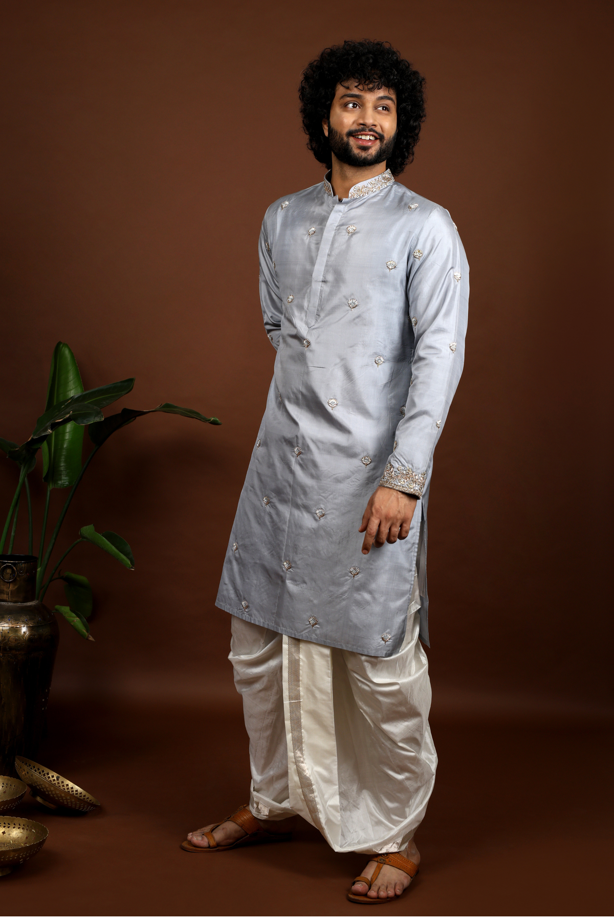 Immerse yourself in the luxurious embrace of kanjivaram pure silk, as the grey kurta exudes refined elegance. 100% pure silk with 1 gm silver Zari work involves weaving threads into the fabric to create beautiful and intricate patterns. The cream dhoti, enhanced by a silver zari border, complements the ensemble , adding a touch of sophistication to Pattu Elegance.