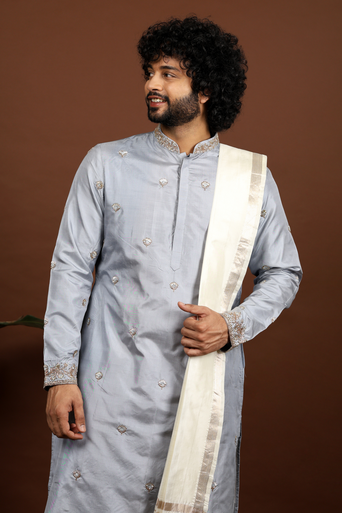 Enter a realm of timeless grace with the Pattu Elegance kurta set. The pure silk grey kurta harmoniously combines with a cream dhoti adorned with a delicate border in shades of peaches and blues, highlighted with intricate hand-embroidered zari and thread work. Elevate your style with hand-embroidered details at the collar and cuffs, adding a touch of refinement.