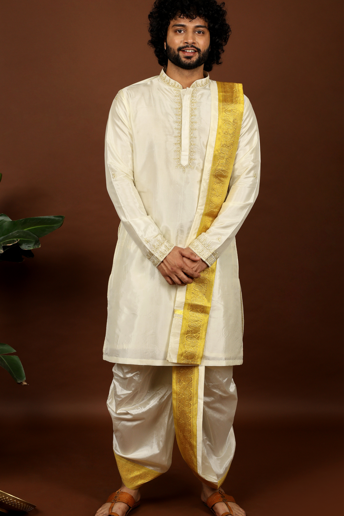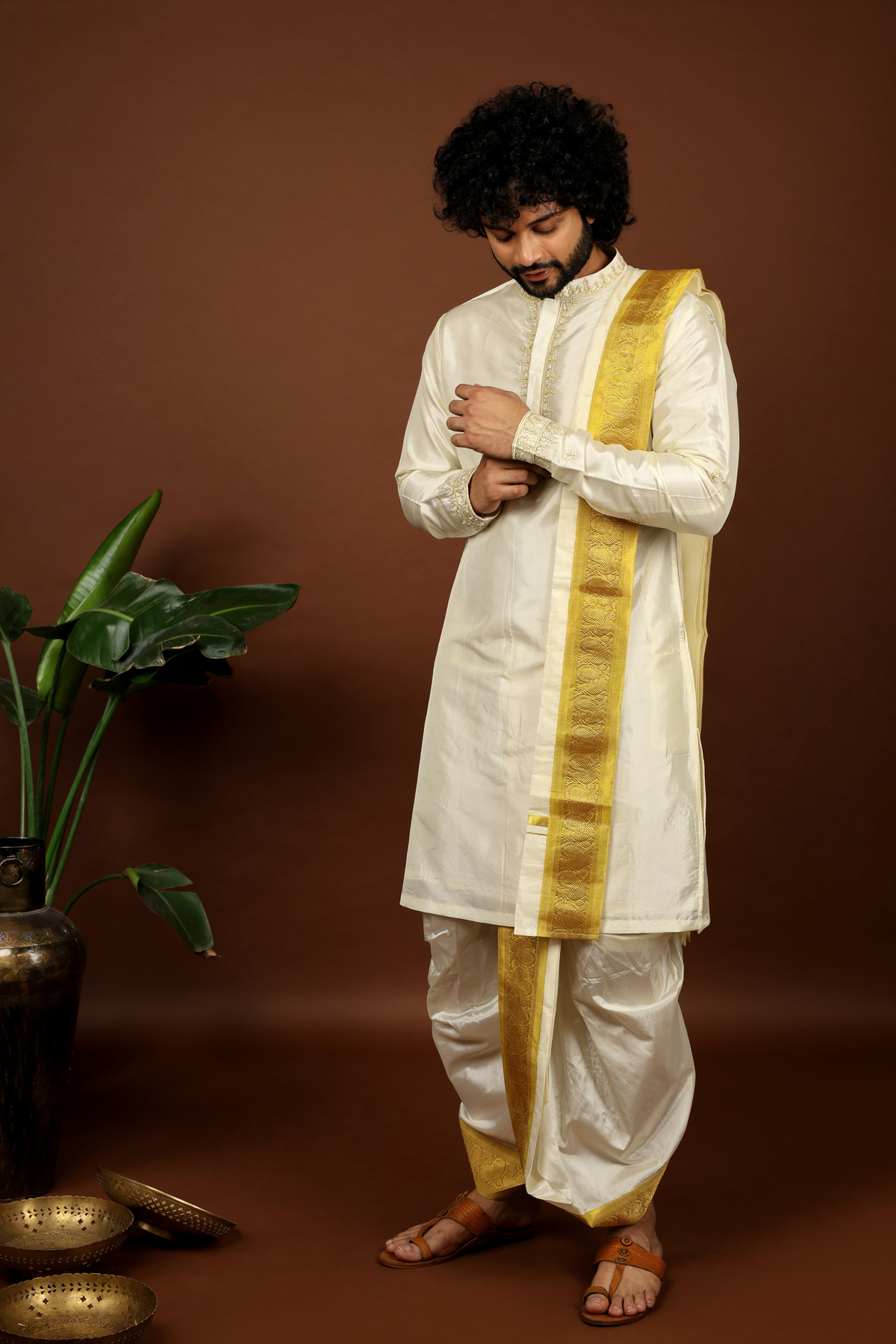Contain: This product contains the whole set. You'll get 1.Pattu Kurta 2.Pattu Dhoti 3.Kanduva
