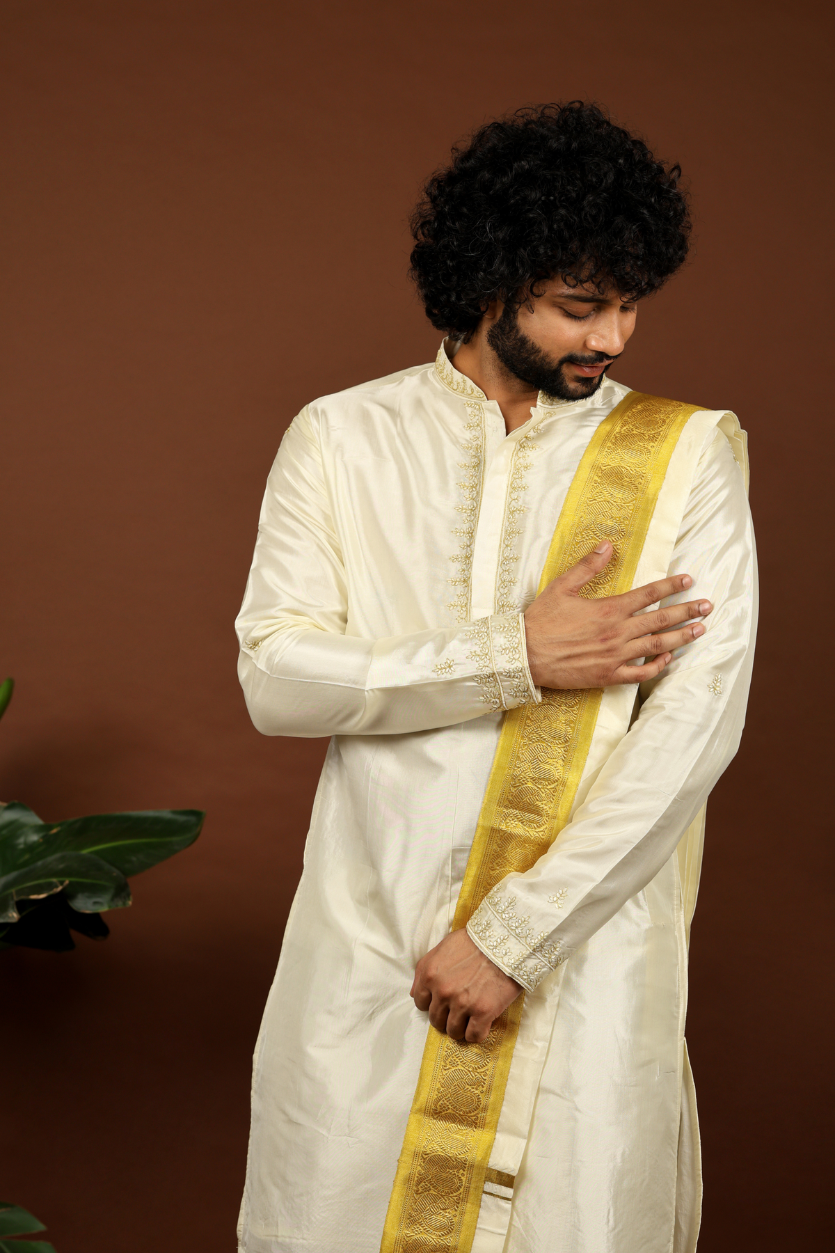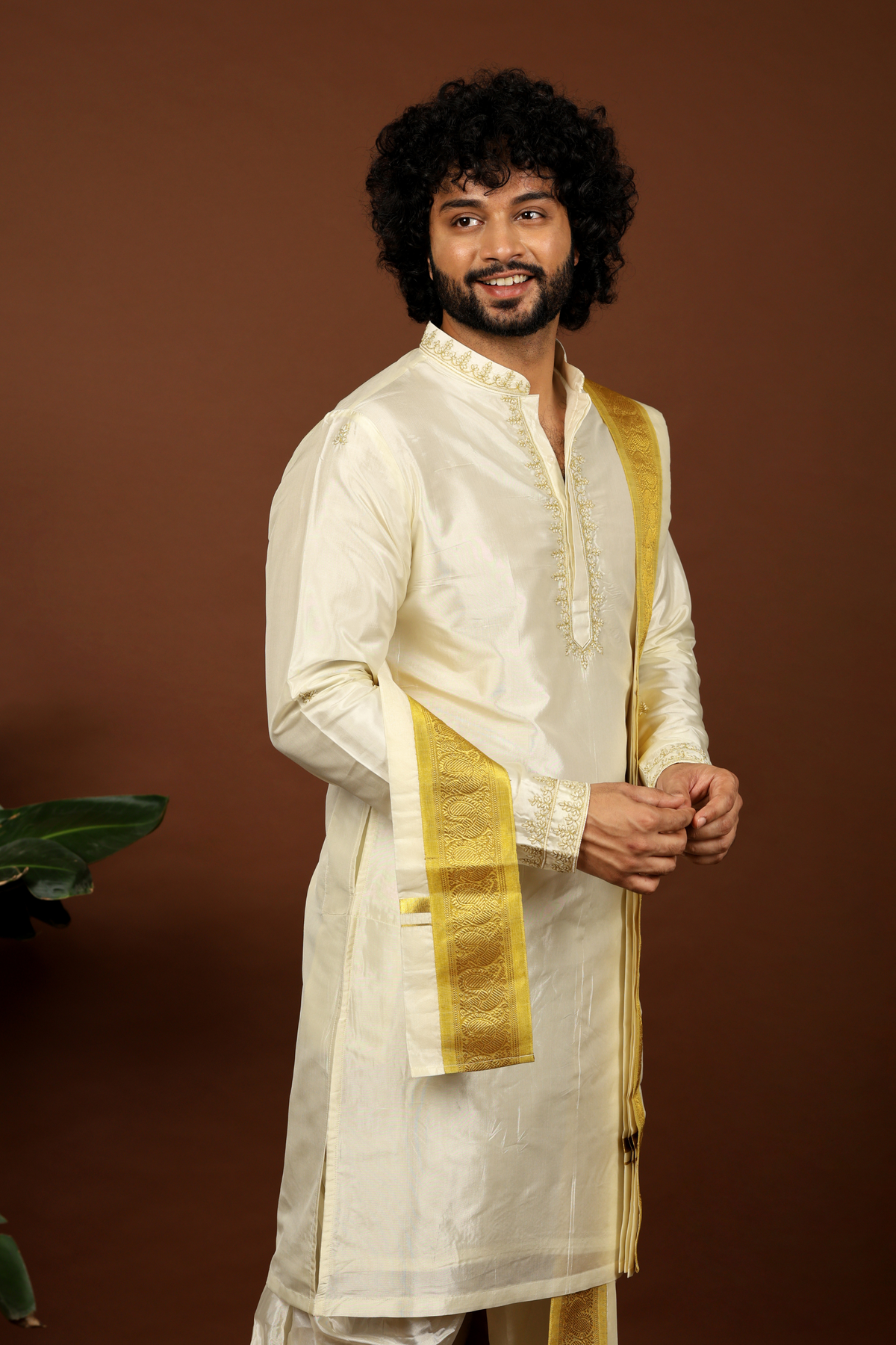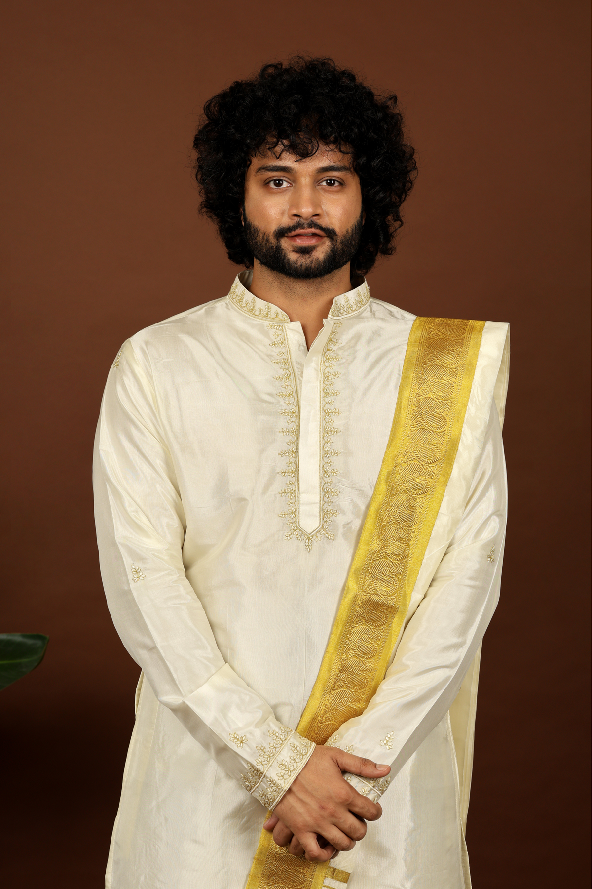 Elevate your style with our majestic Off-White Pattu Kurta Set. Crafted from luxurious pattu fabric, the kurta exudes timeless elegance. Delicate pastel shades of embroidery add a touch of sophistication, making it perfect for special occasions. Experience refined craftsmanship and effortless grace with our exquisite Pattu Kurta Set.