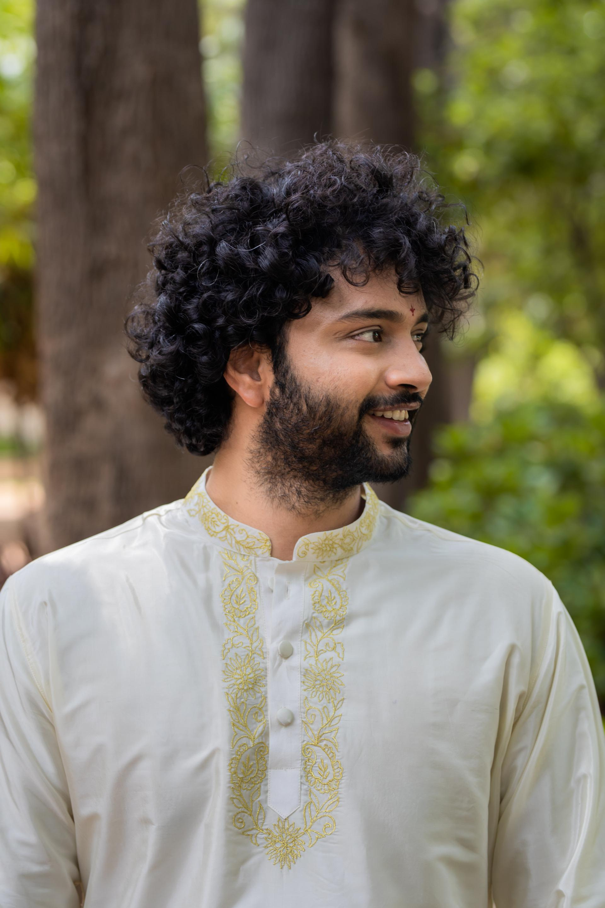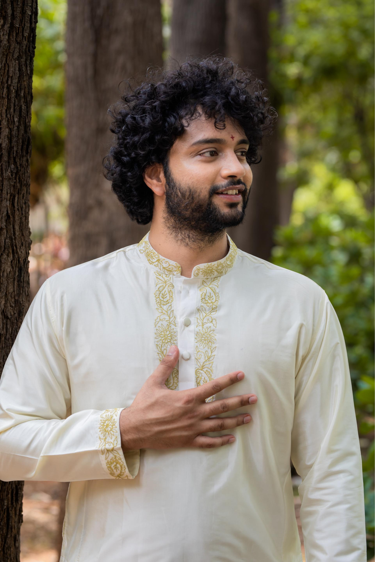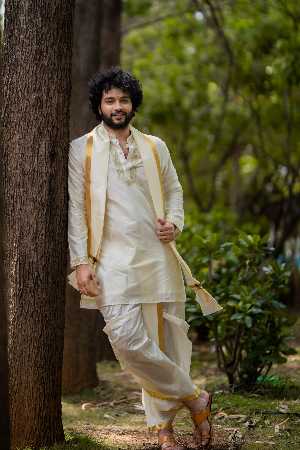 Featuring a machine-embroidered pattu set, for grooms. It's a gold zari-based embroidery on the collar neckline and cuffs. its a set along with a single zari bordered elastic dhoti with gold plain zari borders Kaduva.