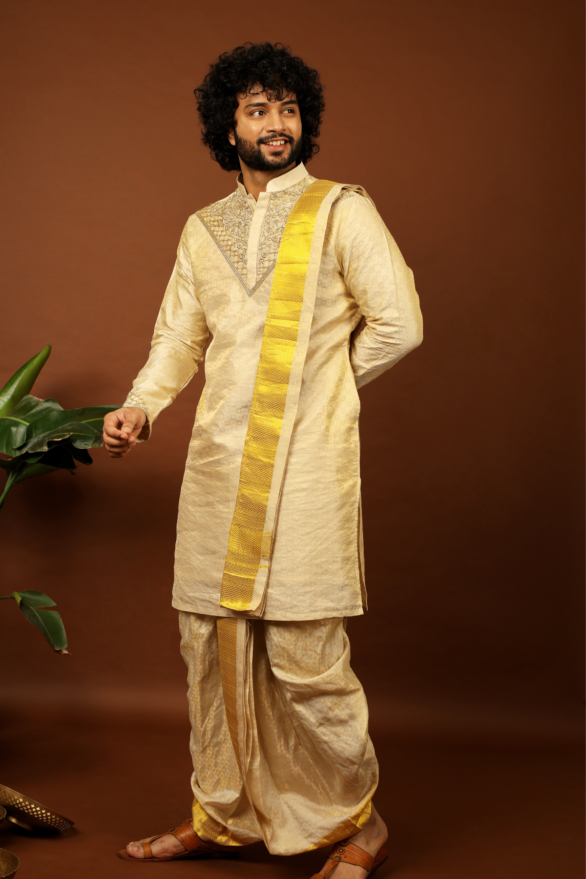 Indulge in sophistication with the Pattu Opulence kurta set. The pure silk tissue kurta, featuring a V-shaped neckline and hand-embroidered V shaped cuffs with cutdana and zari, effortlessly complements the gold-detailed dhoti. Luxuriate in opulence with a self-embossed texture and borders adorned with zari accents.