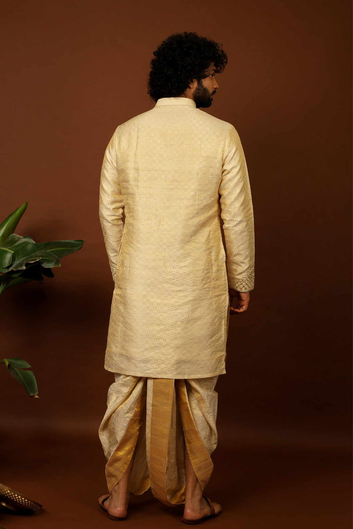Drape yourself in luxury with Kanjivaram gold textured tissue Pattu Gleam's pure silk kurta. The ensemble is elevated by a 100% pure silk with 1gm gold-detailed dhoti, featuring a self-embossed texture and lavish gold zari borders. The threads used are gold in colour, giving rich and regal look enhancing the allure of Pattu Essence, making it a perfect blend of elegance and sophistication.