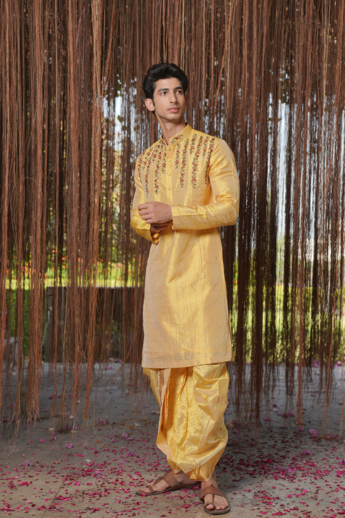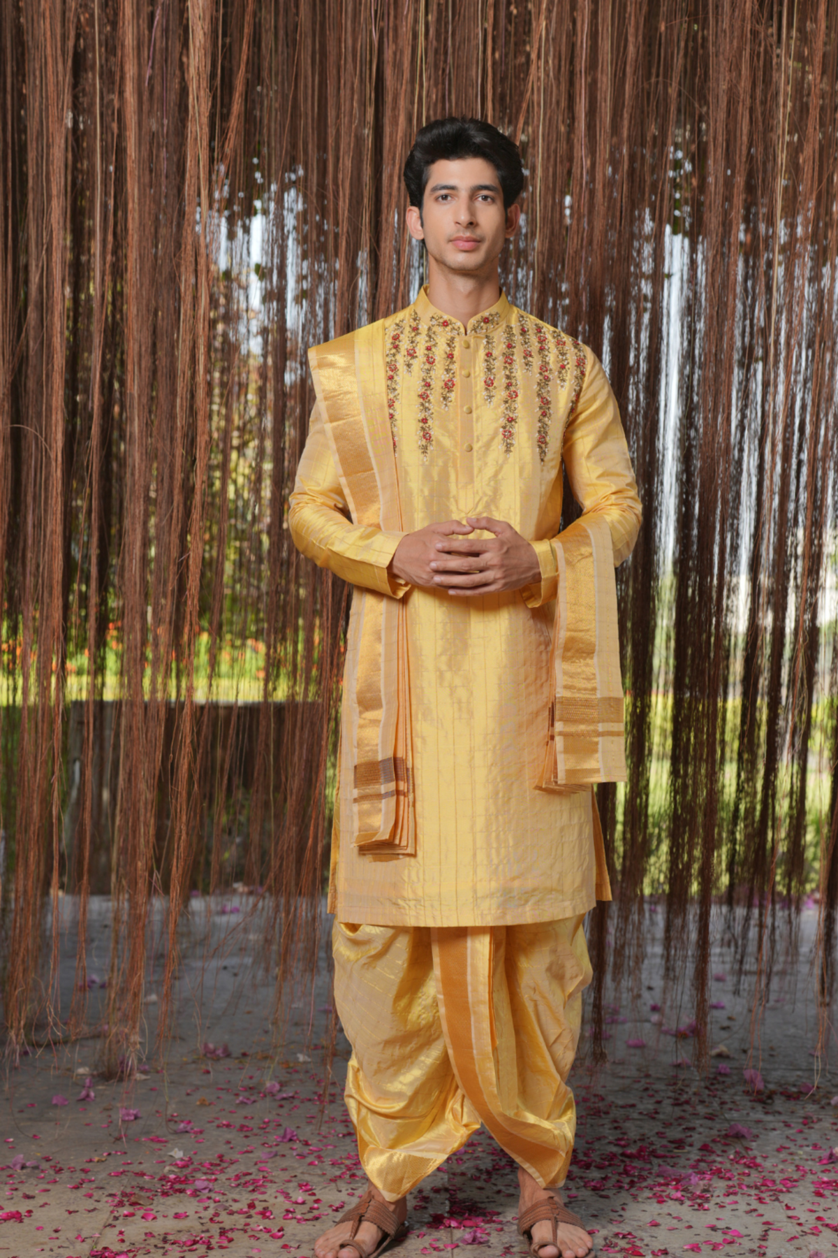 Luxury 100% Kanjivaram Pattu Silk crafted weaved with 1 gm gold coated zari. Threads woven into a luxurious two tone glossy finish and vibrant hues. The fabric is skin-friendly, durable, and retains its opulent texture while offering a graceful drape.
