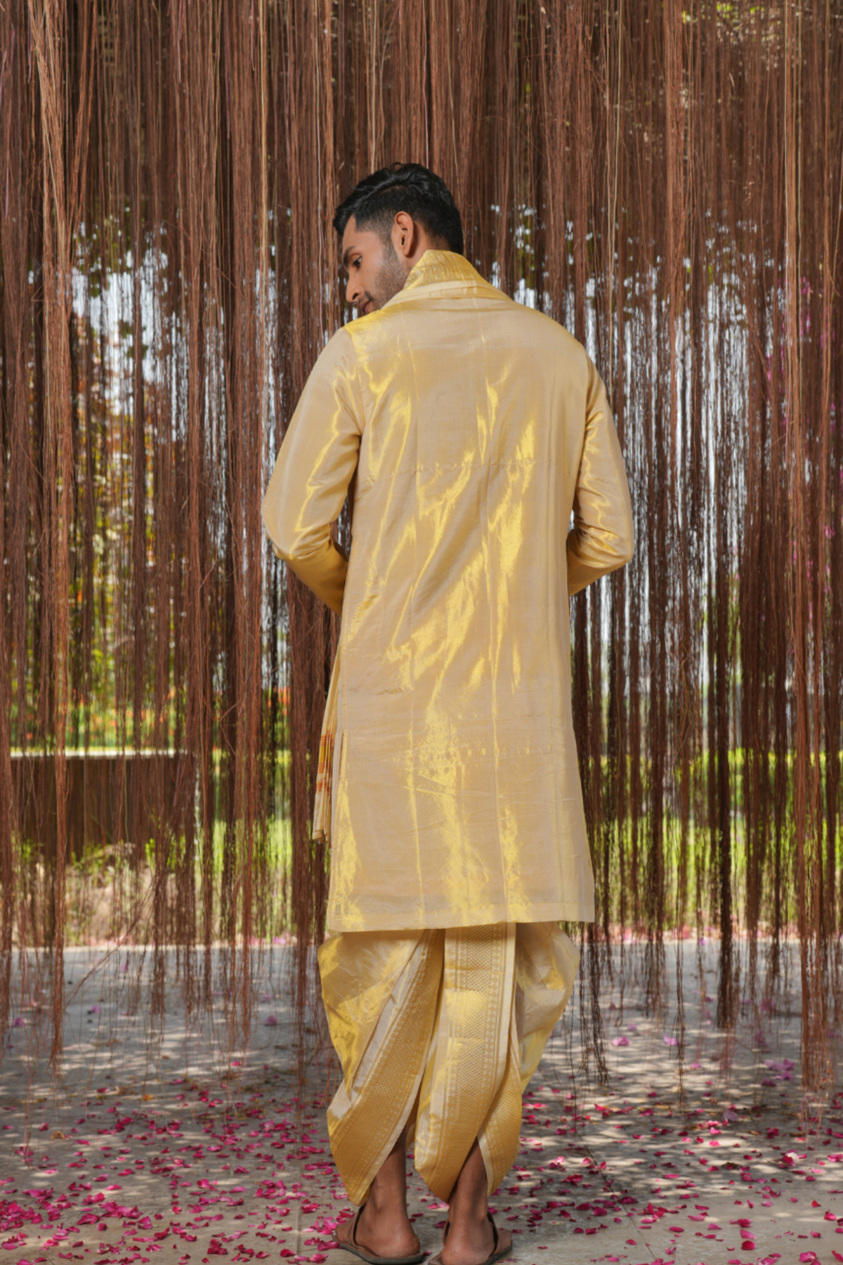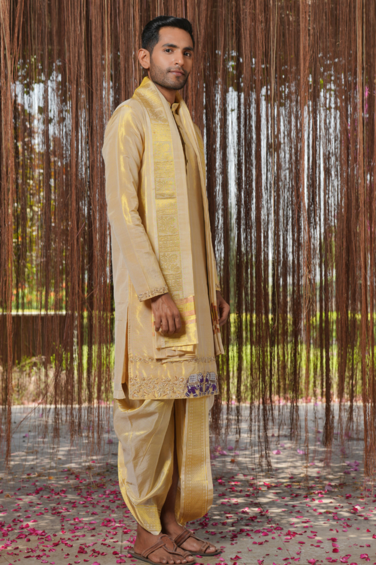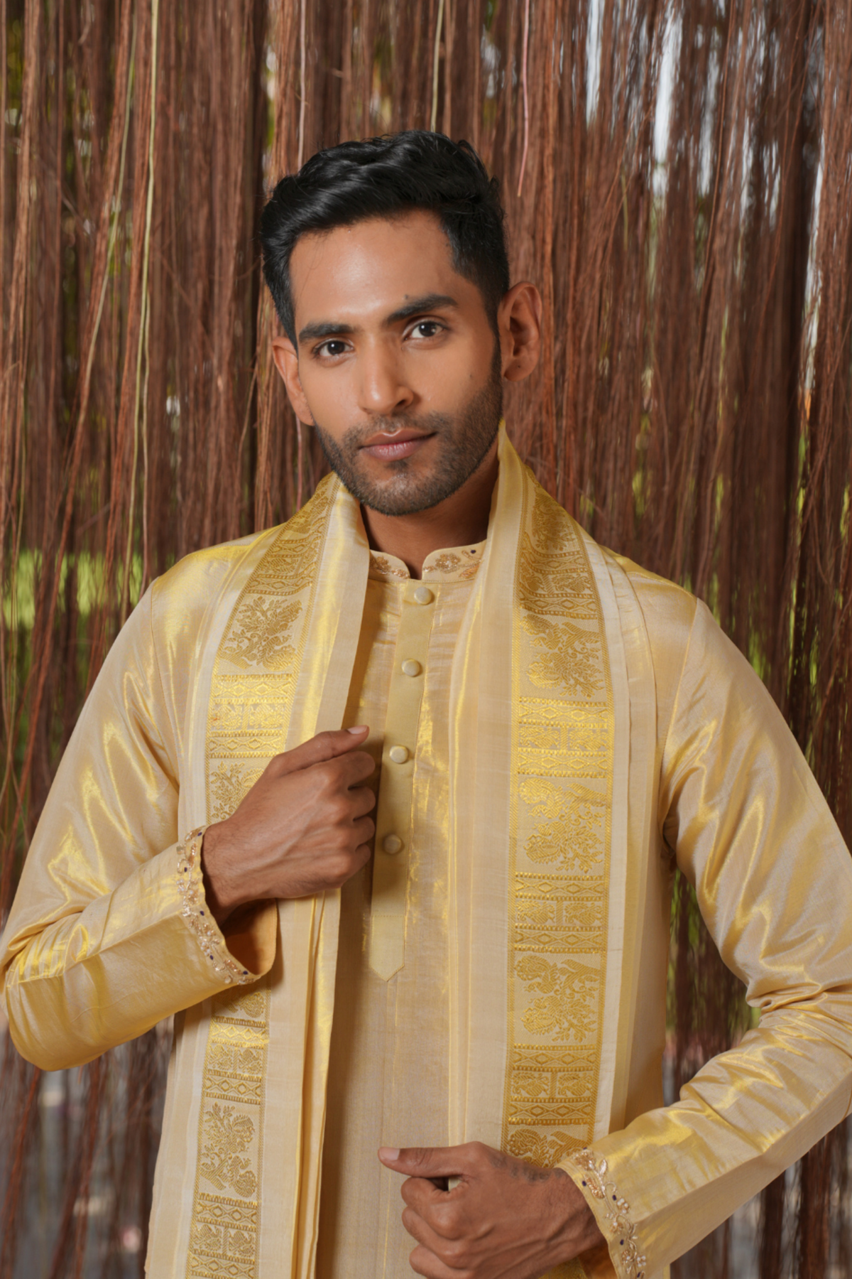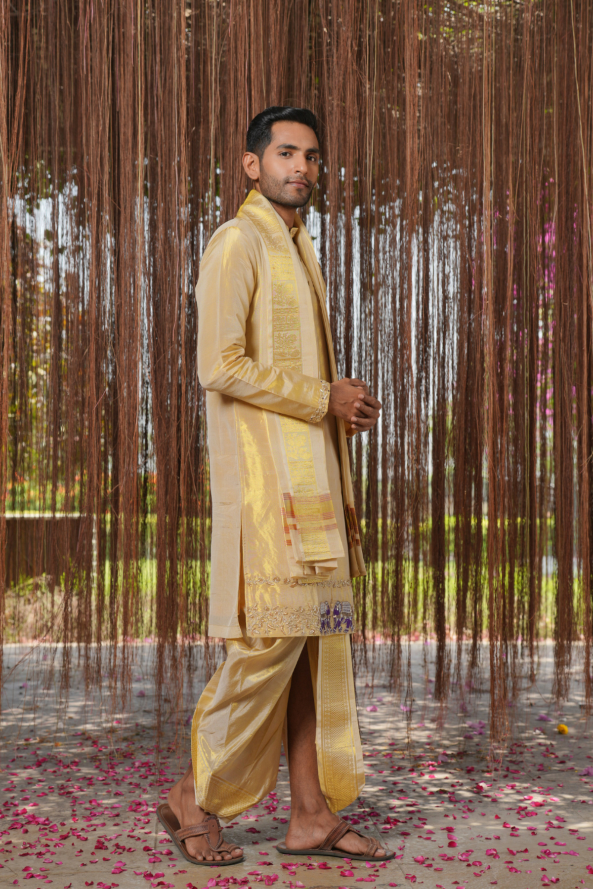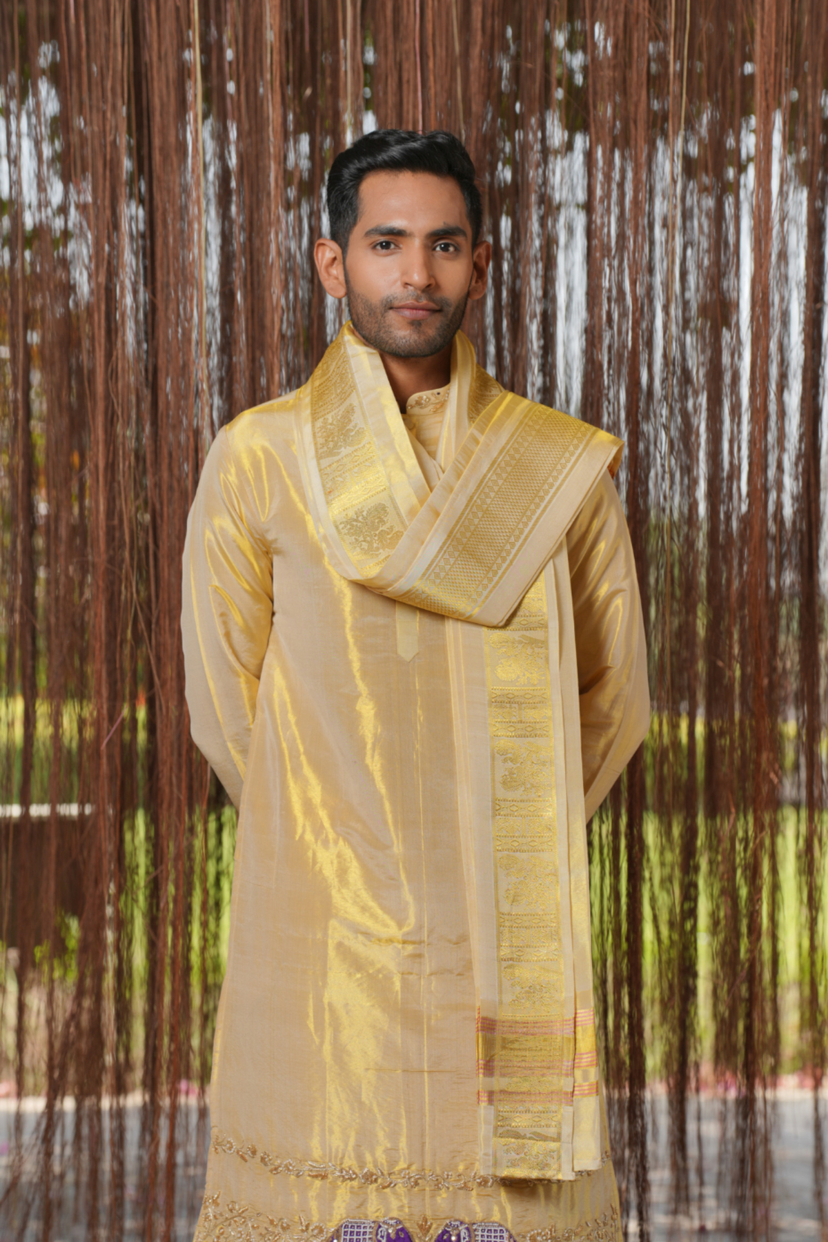 Unveil your royal side with the VARNA - Gold Tissue Kanjivaram Machine Embroidered Pattu Set. This exquisite full-sleeve ensemble is meticulously crafted to showcase the timeless artistry of Kanjivaram weaves enhanced with delicate machine embroidery. The radiant gold tissue fabric adds an ethereal charm, making it a perfect choice for weddings, festive celebrations, and cultural ceremonies. With its perfect blend of tradition, elegance, and comfort, VARNA is designed to leave a lasting impression.