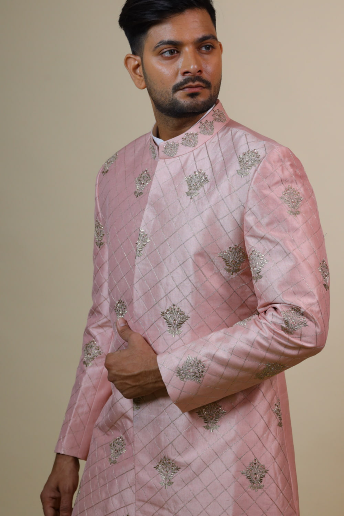 Featuring Light coral coloured sherwani with golden motifs.The golden zari textured criss-cross lines makes it look Elegant. This is a perfect product to keep all eyes on you on your special day. This is a custom made to fit sherwani, will be made only on order after we confirm your measurement.