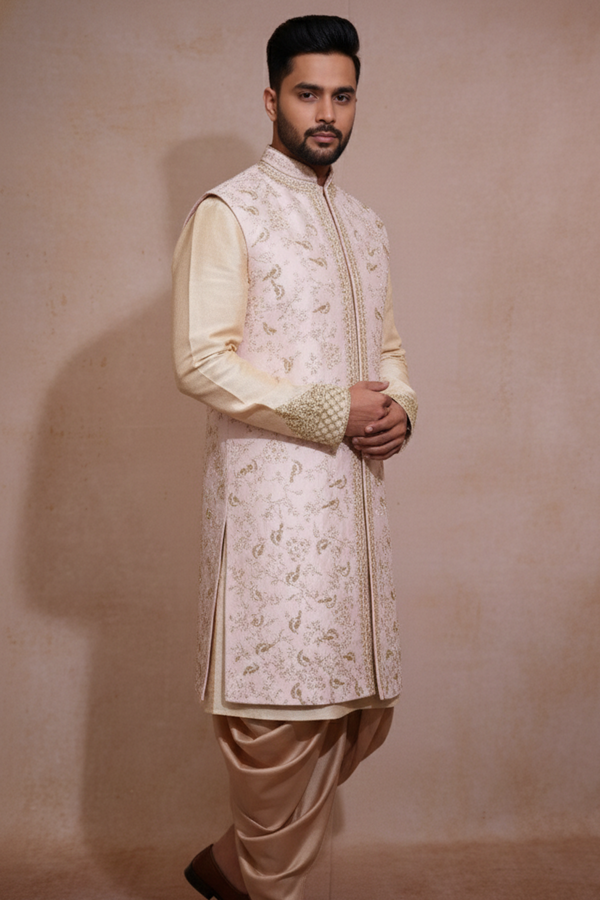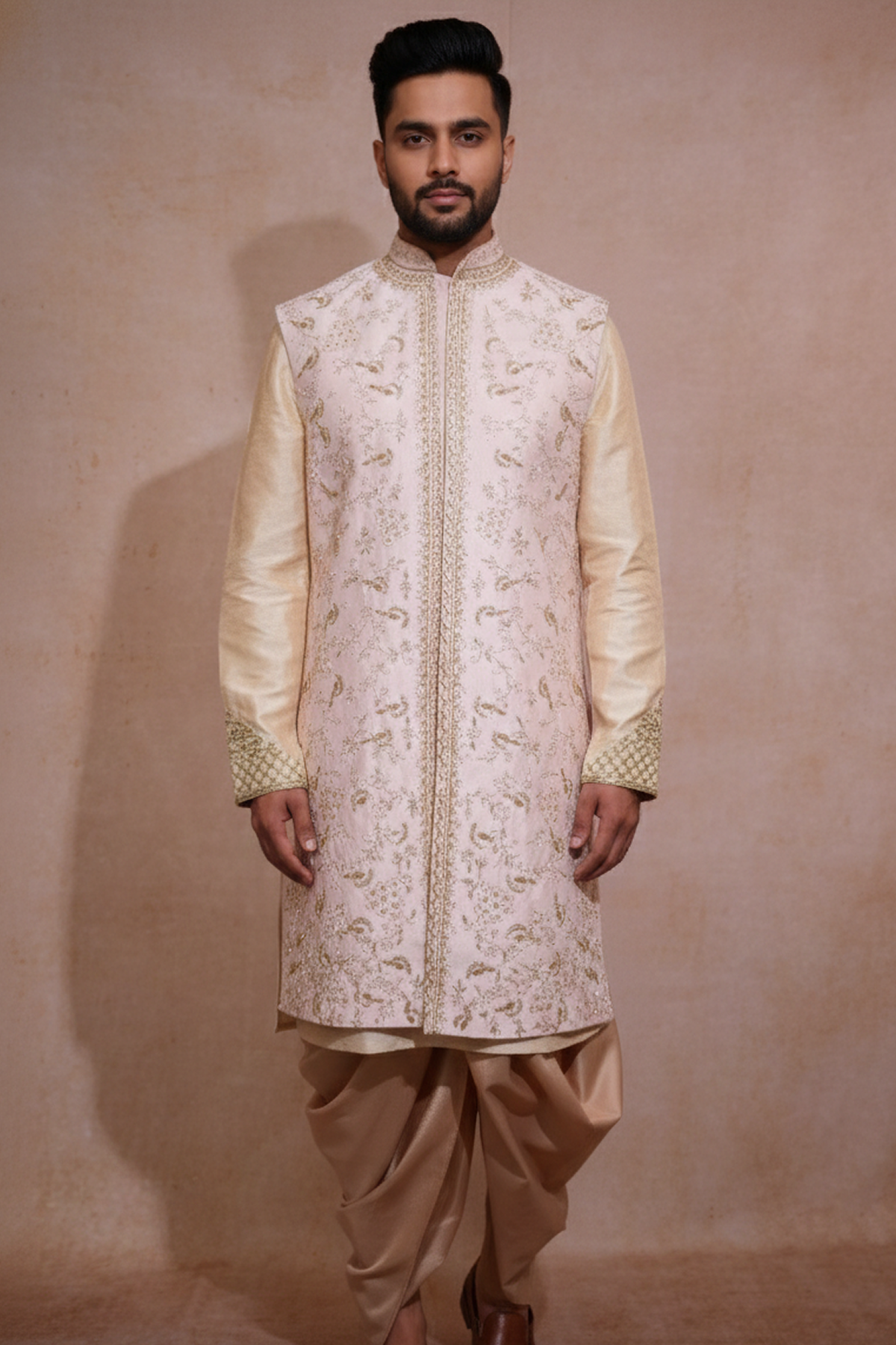 FABRIC DECRIPTION : Crafted in premium festive fabric with an elegant textured finish, this jacket–kurta–dhoti set is designed to deliver a rich, royal look with a graceful fall. The fabric feels smooth and comfortable on the skin while maintaining a structured silhouette that looks sharp in every movement. Perfect for long celebrations, the set balances traditional luxury with modern tailoring—making it an ideal choice for weddings, festive occasions, and special events.