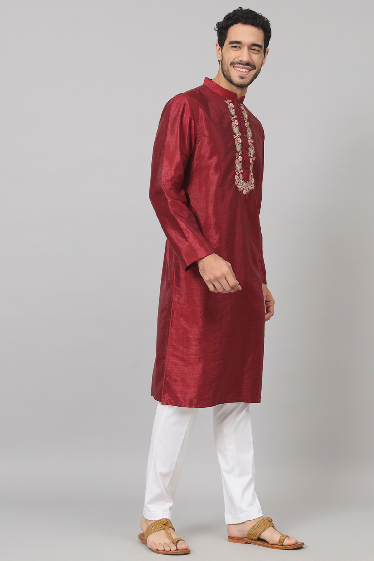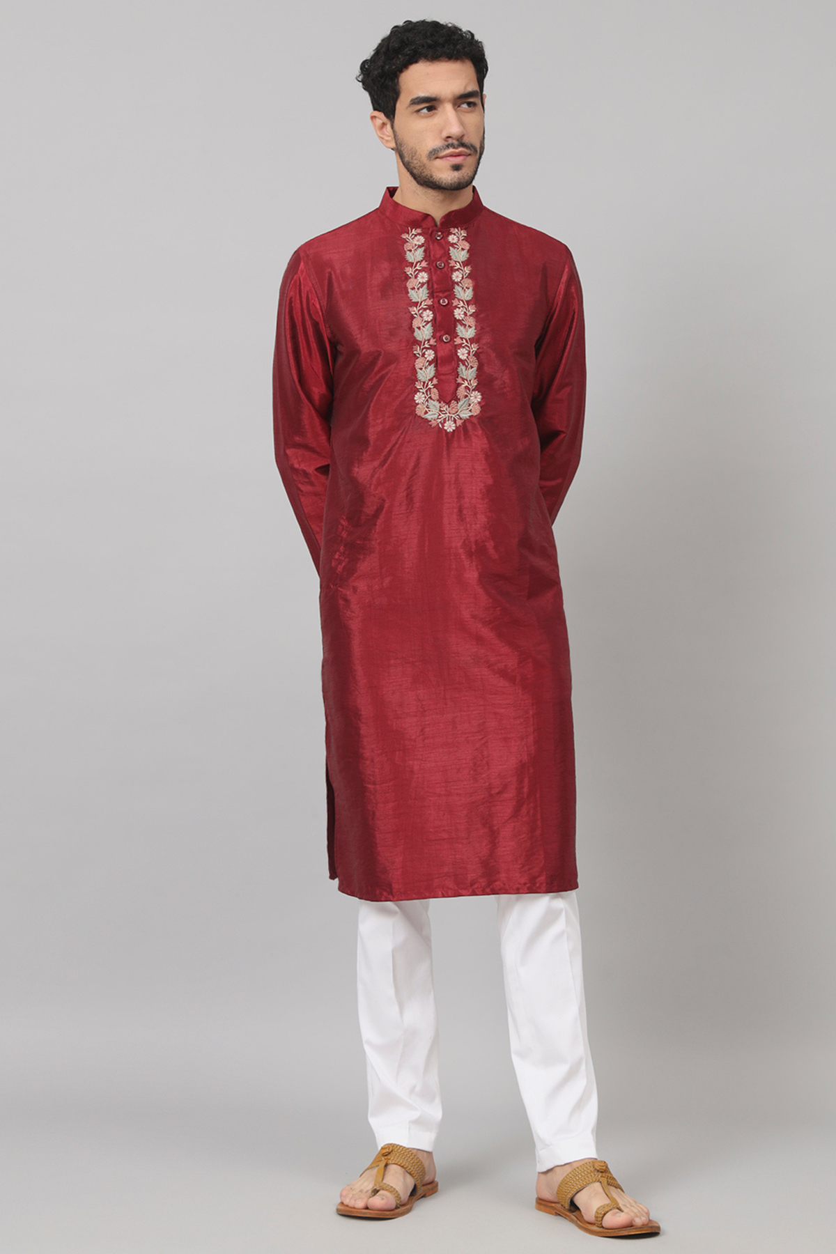 Introducing our Off-White Kurta adorned with Abstract Pink Floral Embroidery, a symphony of modern artistry and timeless elegance. This exquisite piece boasts an abstract arrangement of delicately embroidered pink florals, each petal intricately crafted to create a captivating visual narrative. Against the serene off-white backdrop, the vibrant pink hues dance gracefully, evoking a sense of whimsical charm and refined sophistication. This kurta effortlessly blends artistic expression with traditional craftsmanship, making it a versatile and enchanting addition to your wardrobe, ideal for expressing your unique style with grace and elegance.