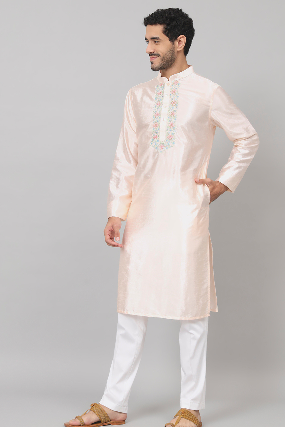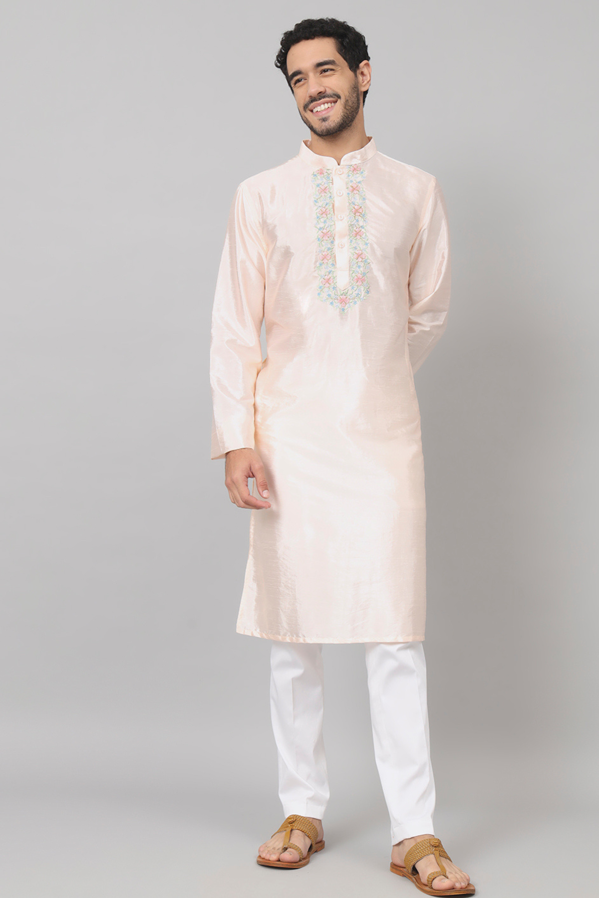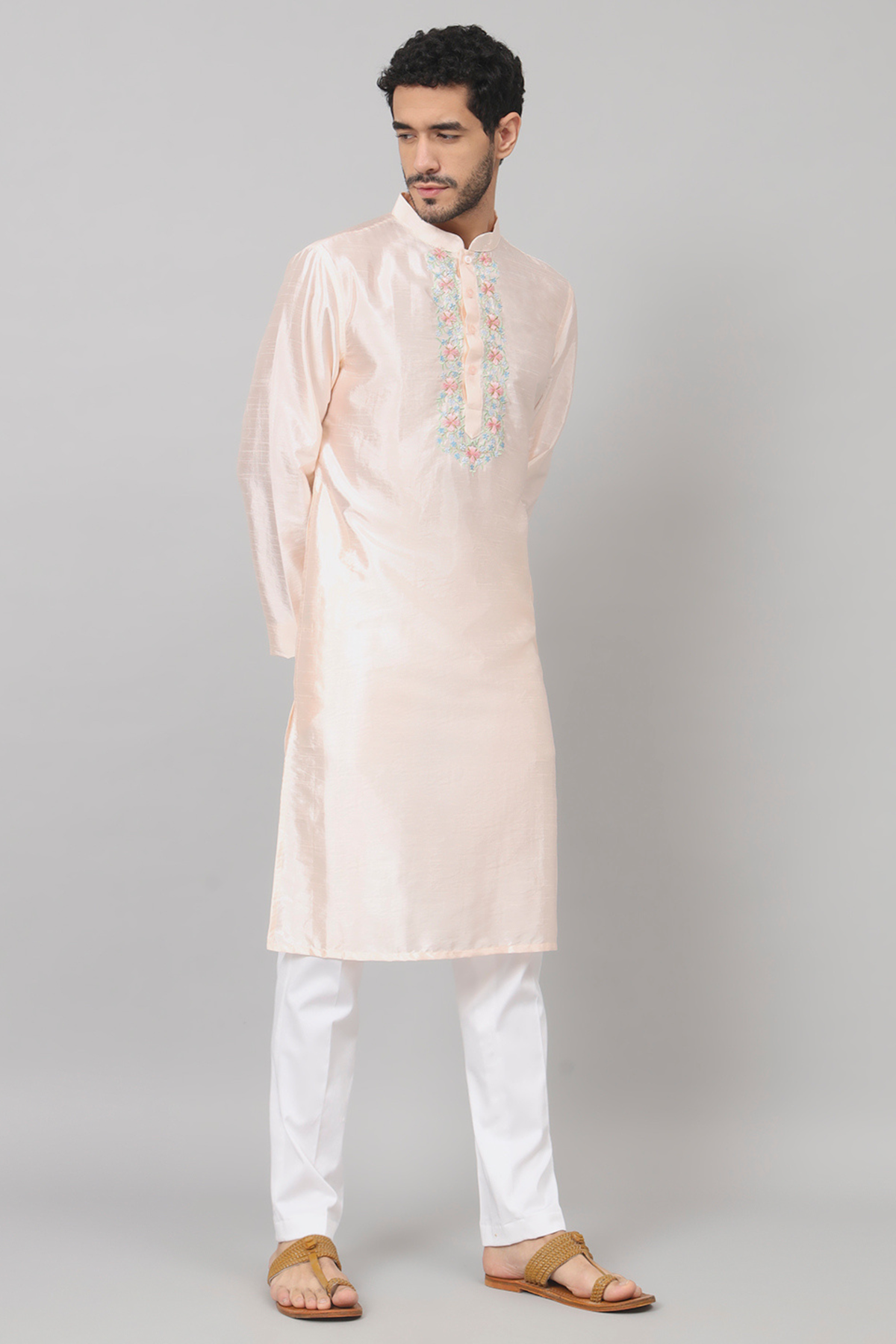Introducing our Peach Embroidered Kurta, where elegance meets exquisite craftsmanship. Adorned with delicate embroidery on the chest, this kurta exudes understated charm and sophistication. The intricate colored embroidery creates a captivating focal point, adding a touch of subtle allure to the garment. Its meticulously crafted design effortlessly complements the soft hue of the fabric, making it a versatile piece suitable for various occasions. Elevate your style with this timeless kurta, a perfect blend of refined detailing and graceful simplicity.