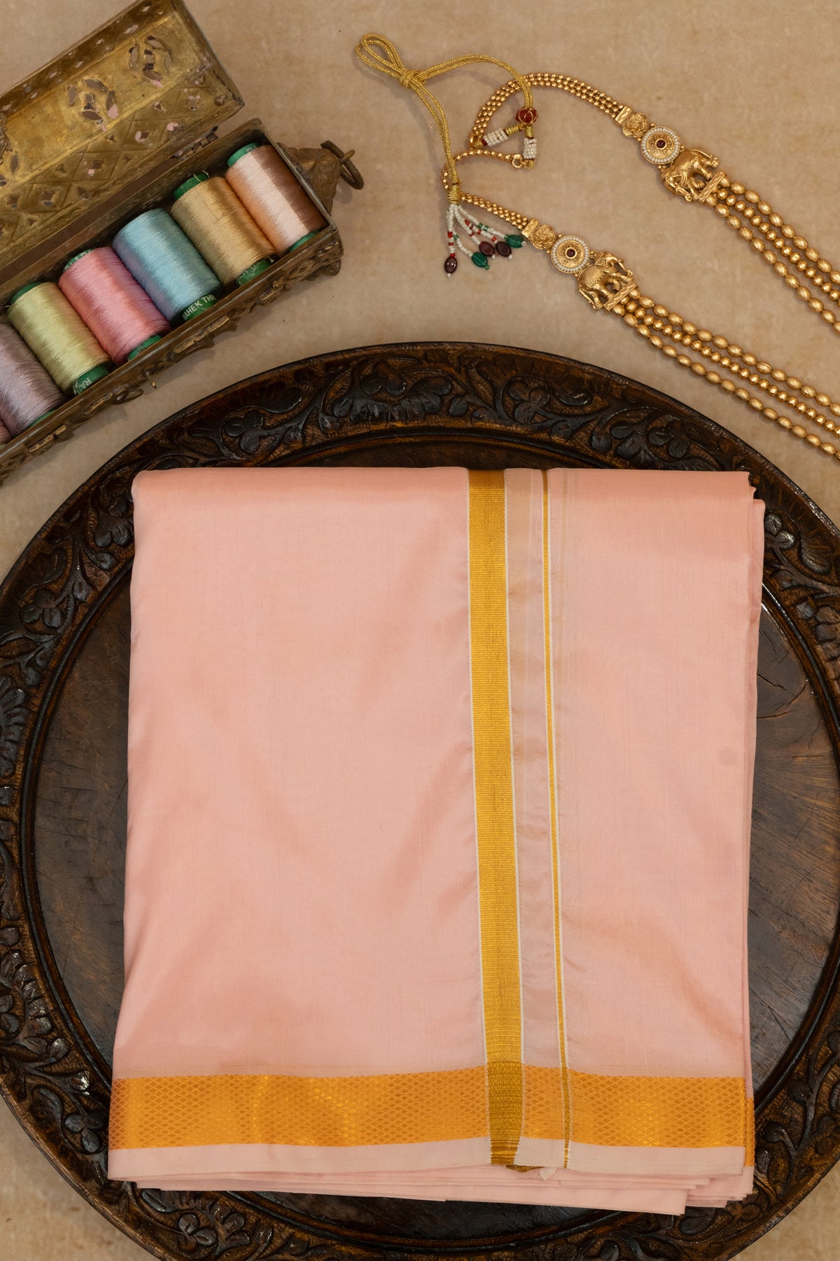 DESCRIPTION : Pranava is a soft and serene pastel pink fine-silk fabric crafted for those who cherish timeless elegance and cultural refinement. Its gentle hue is complemented by a smooth, lightweight drape and a subtle natural sheen, giving it a graceful and premium appearance. Enhanced with luminous zari detailing, Pranava blends traditional artistry with understated sophistication, making it ideal for dhotis, saree borders, ethnic menswear, and festive couture. This fabric brings a harmonious balance of simplicity, charm, and classic beauty to every ensemble.