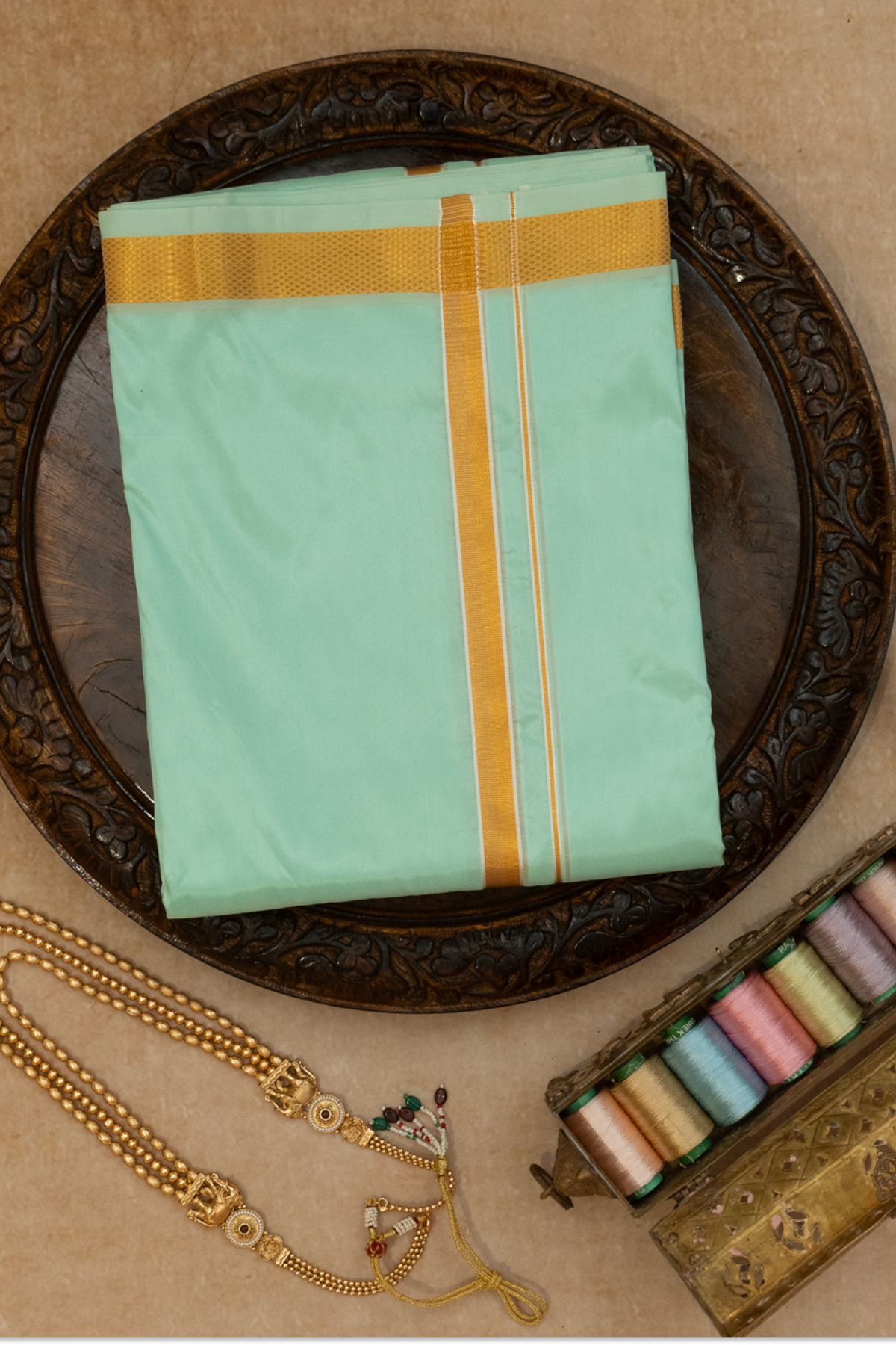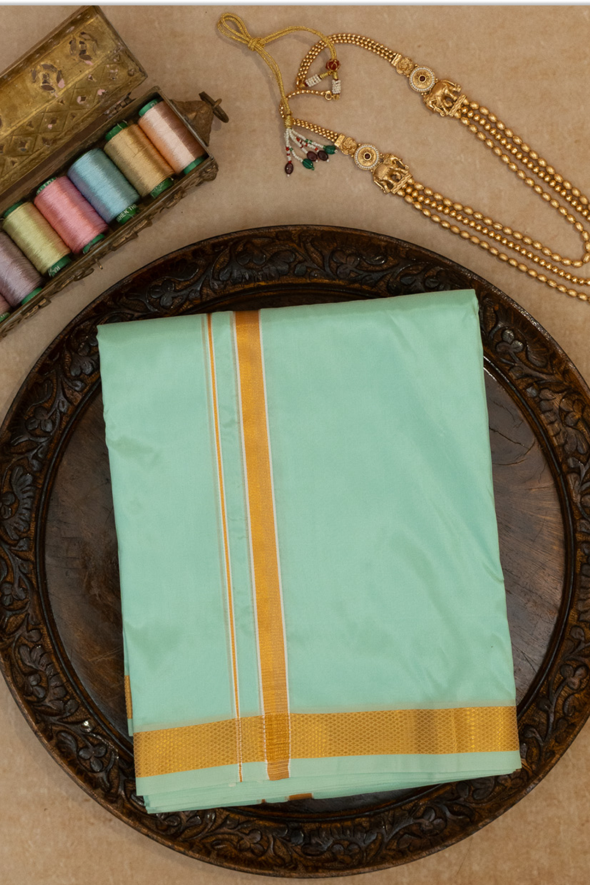 FABRIC DECRIPTION : Vaibhav is a premium fine-silk fabric in a calming sea-green shade, designed to bring together traditional charm and modern refinement. Its smooth texture and natural sheen lend a luxurious finish, while the subtle zari detailing adds a touch of festive elegance. Lightweight and graceful in its fall, this fabric is perfect for crafting dhotis, ethnic menswear, saree borders, and contemporary traditional outfits.A timeless choice for those who appreciate elegance, comfort, and exquisite craftsmanship. KEY FEATURES