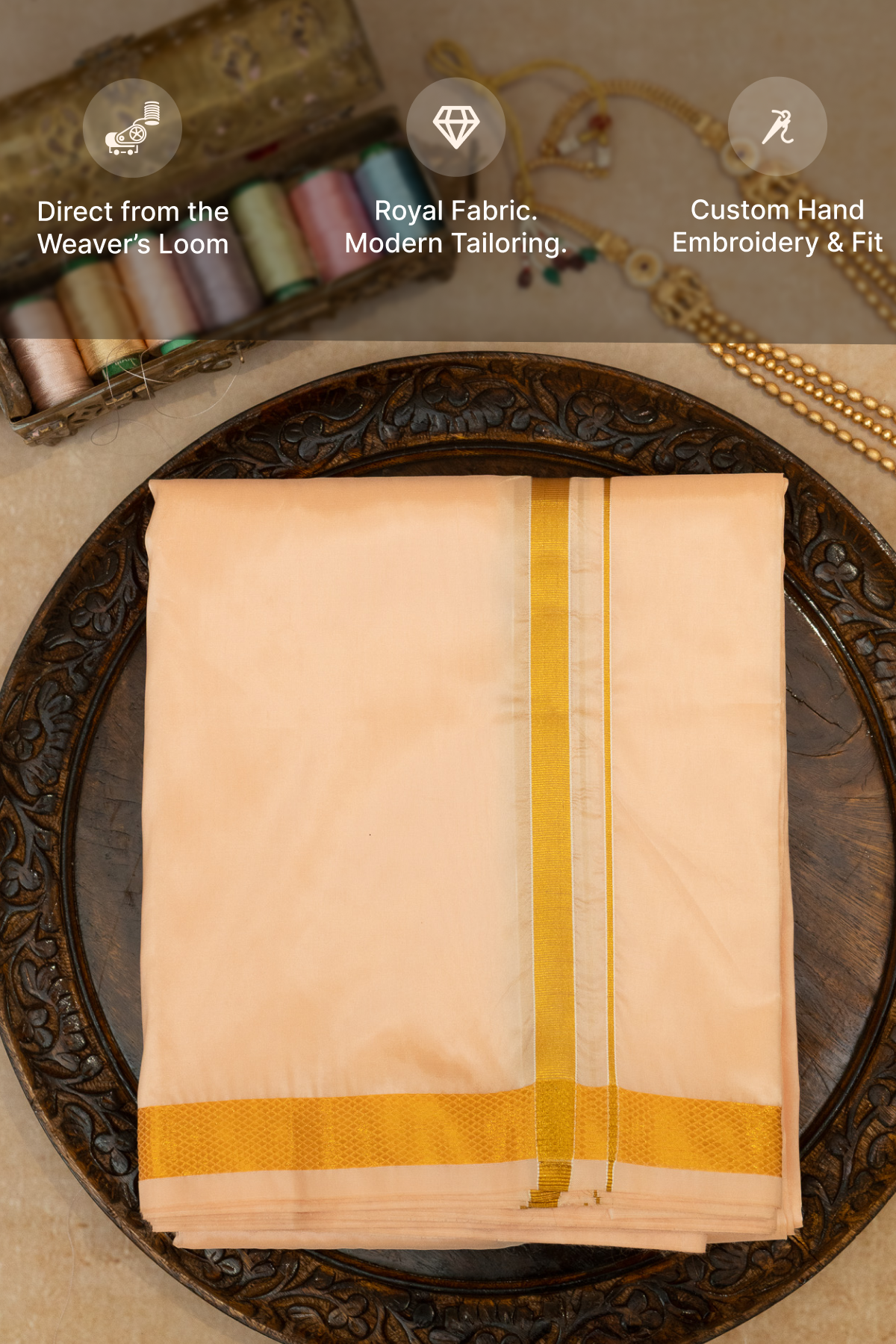 DESCRIPTION : Chandanaya is a luxurious cream-gold fine silk fabric inspired by the sacred shade of sandalwood. Its champagne-toned elegance is enhanced by a subtle natural sheen, offering a rich and traditional look. The sleek dual-line gold border adds timeless charm, while the finely woven edges bring a festive and sophisticated touch—making it an ideal choice for premium dhotis and ethnic wear.