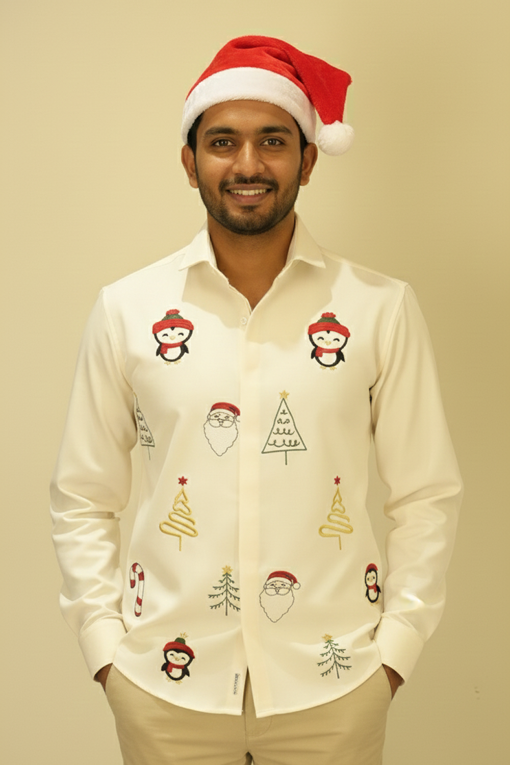 DESCRIPTION : Celebrate the season in effortless style with our Merry Motifs Festive Embroidered Shirt. Crafted in a refined off-white tone, this shirt features playful yet elegant Christmas-inspired embroidery, including Santa, penguins, Christmas trees, candy canes, and festive icons. The balanced placement of motifs adds charm without overpowering the look, making it perfect for holiday gatherings, office celebrations, and casual festive outings. Pair it with chinos or denim for a smart, cheerful statement.