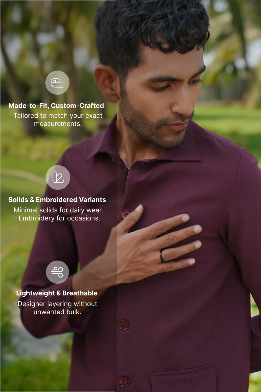 A versatile fusion of shirt and jacket, the Mono Merge Shacket offers a sleek, modern fit with full sleeves and a deep burgundy hue. It is made with zero padding but with minimal fusing to give a structure. ultimate comfort and movement, it's perfect for layering across seasons.