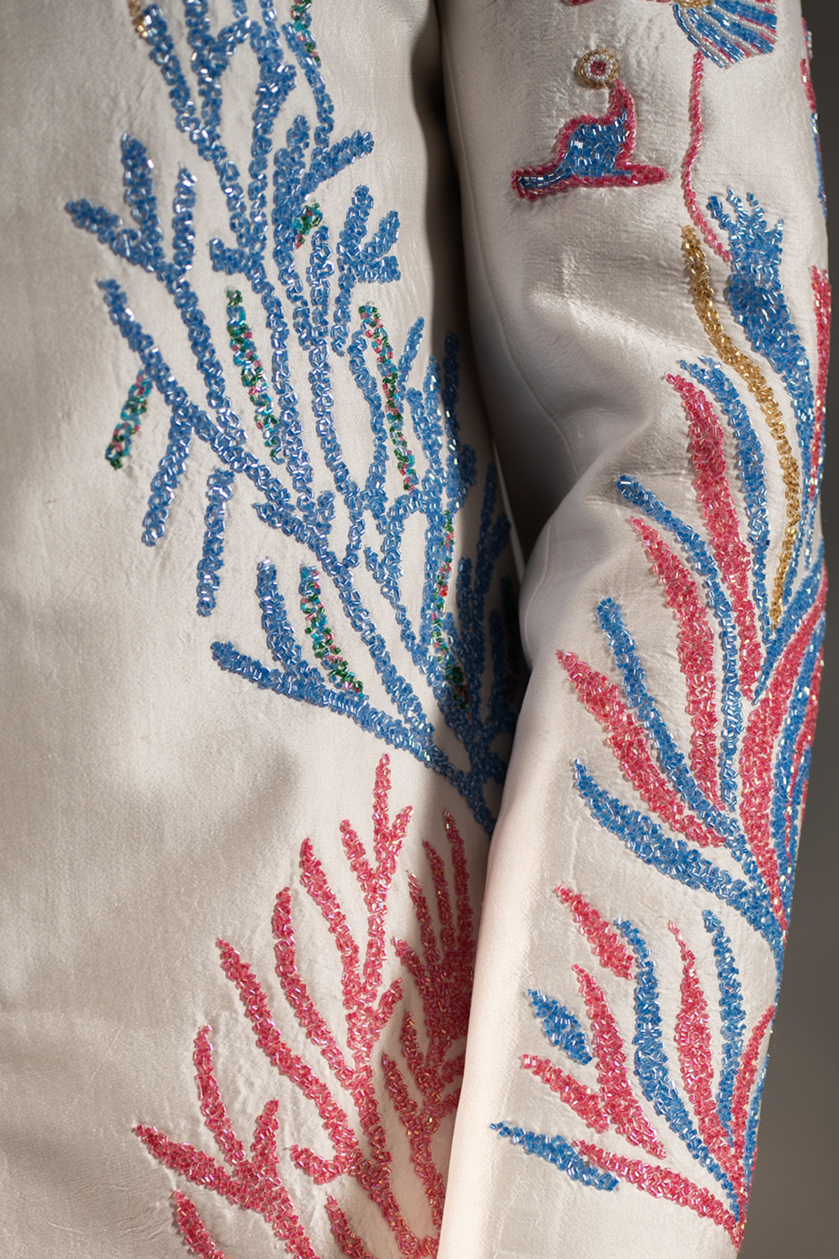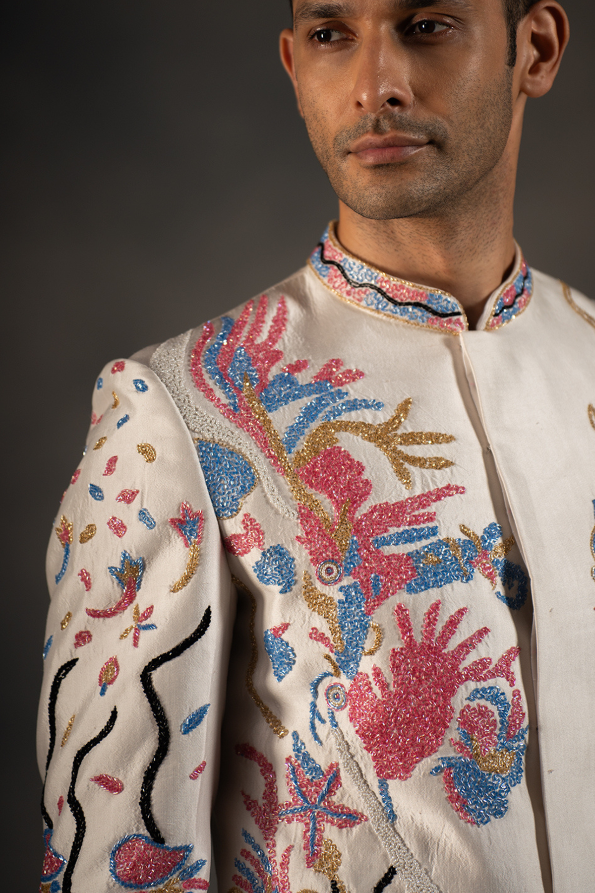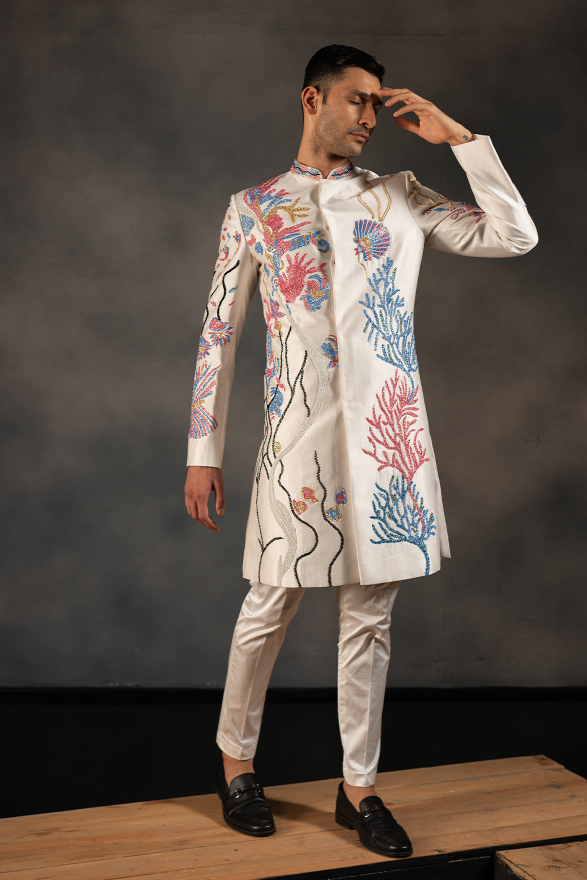 Introducing our exquisite off-white IndoWestern sherwani, a stunning piece that brings together the elegance of traditional craftsmanship and contemporary design. Adorned with a vibrant coral underwater odyssey motif, this sherwani features a mesmerizing palette of blues and pinks, accentuated with delicate touches of whites, blacks, and golds. The intricate embellishments of sequins and cutdana cover the entire garment, creating a luxurious and eye-catching finish. Perfect for any festive occasion, this sherwani seamlessly blends sophistication with a playful aesthetic, making it a must-have addition to your wardrobe.