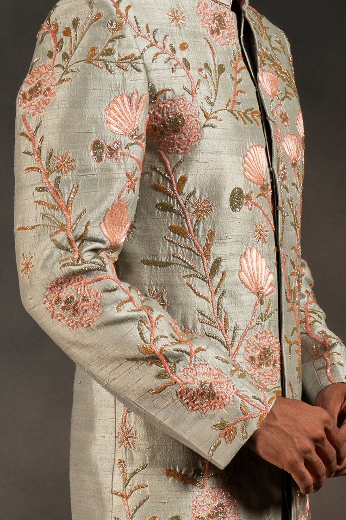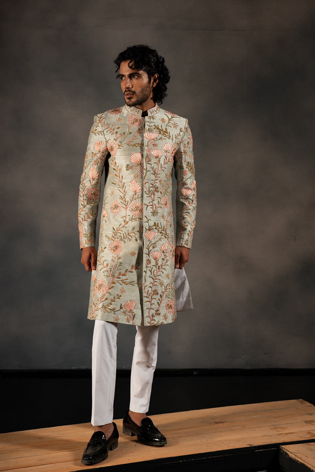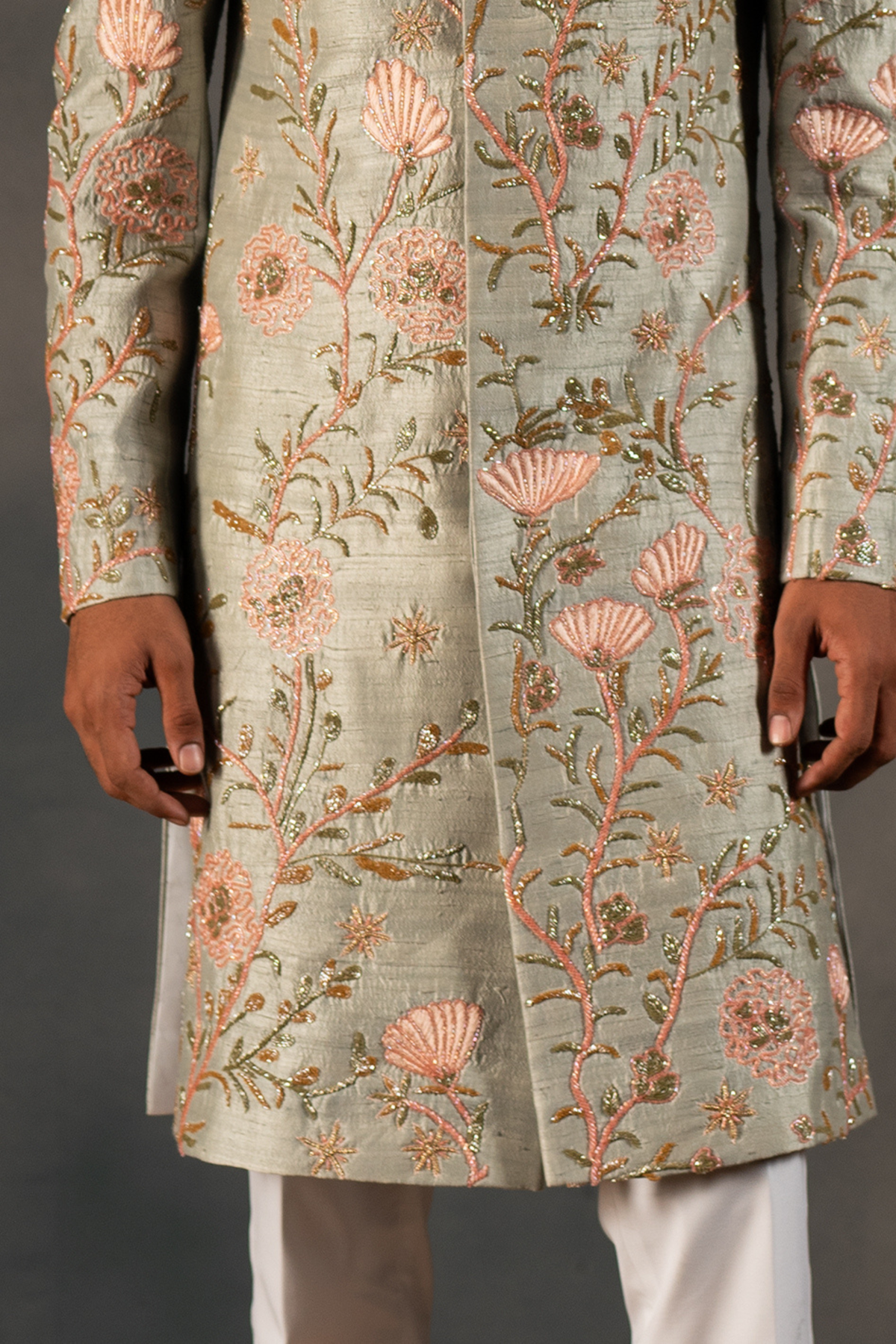 Introducing our elegant pastel green IndoWestern sherwani, crafted from luxurious raw silk that offers a rich texture and subtle sheen. The fabric has a slightly crisp yet soft feel, providing a structured silhouette while remaining comfortable against the skin. Its natural luster enhances the intricate hand embroidery of coral floral jal, featuring delicate pastel peaches and greens with accents of gold cutdana work. The raw silk’s breathable quality makes it ideal for festive occasions, ensuring you stay stylish and comfortable while exuding sophistication and charm.