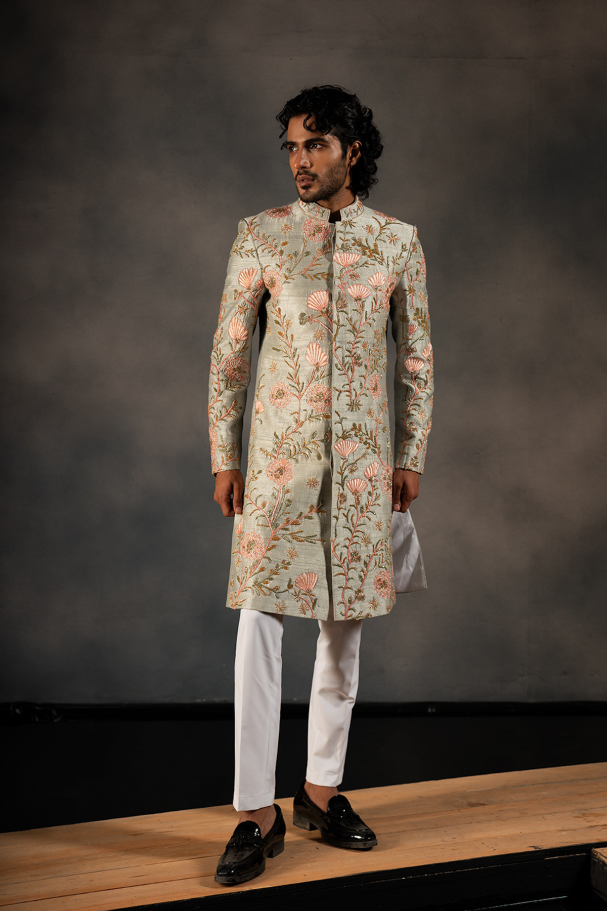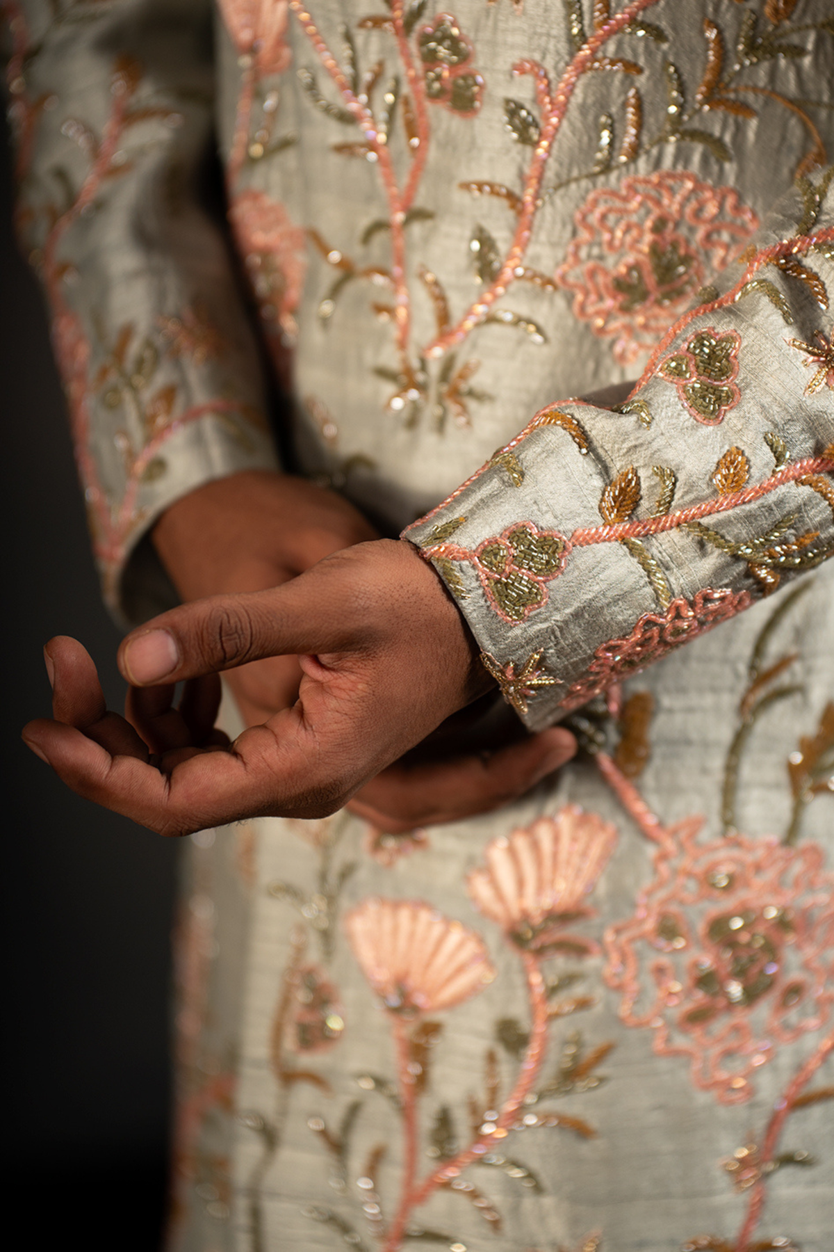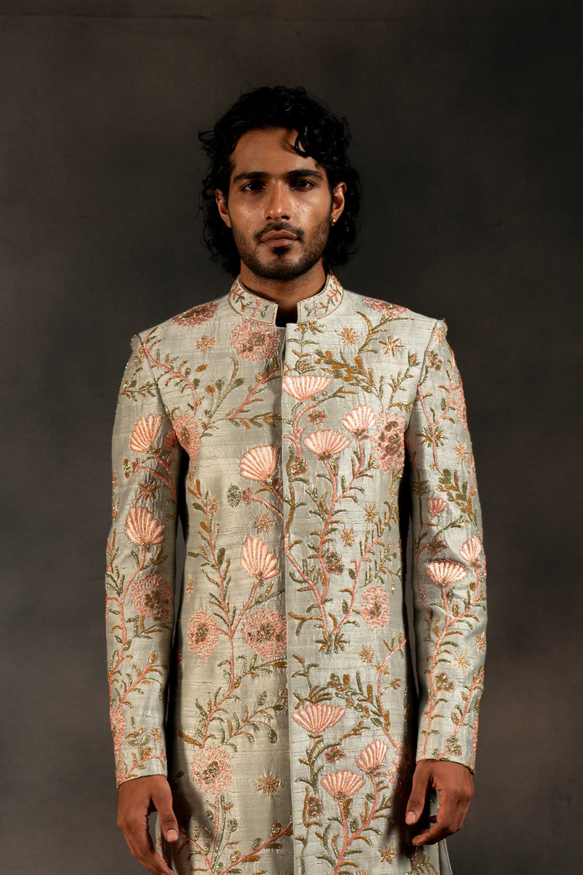 Introducing our elegant pastel green IndoWestern sherwani, crafted from luxurious raw silk that offers a rich texture and subtle sheen. The fabric has a slightly crisp yet soft feel, providing a structured silhouette while remaining comfortable against the skin. Its natural luster enhances the intricate hand embroidery of coral floral jal, featuring delicate pastel peaches and greens with accents of gold cutdana work. The raw silk’s breathable quality makes it ideal for festive occasions, ensuring you stay stylish and comfortable while exuding sophistication and charm.