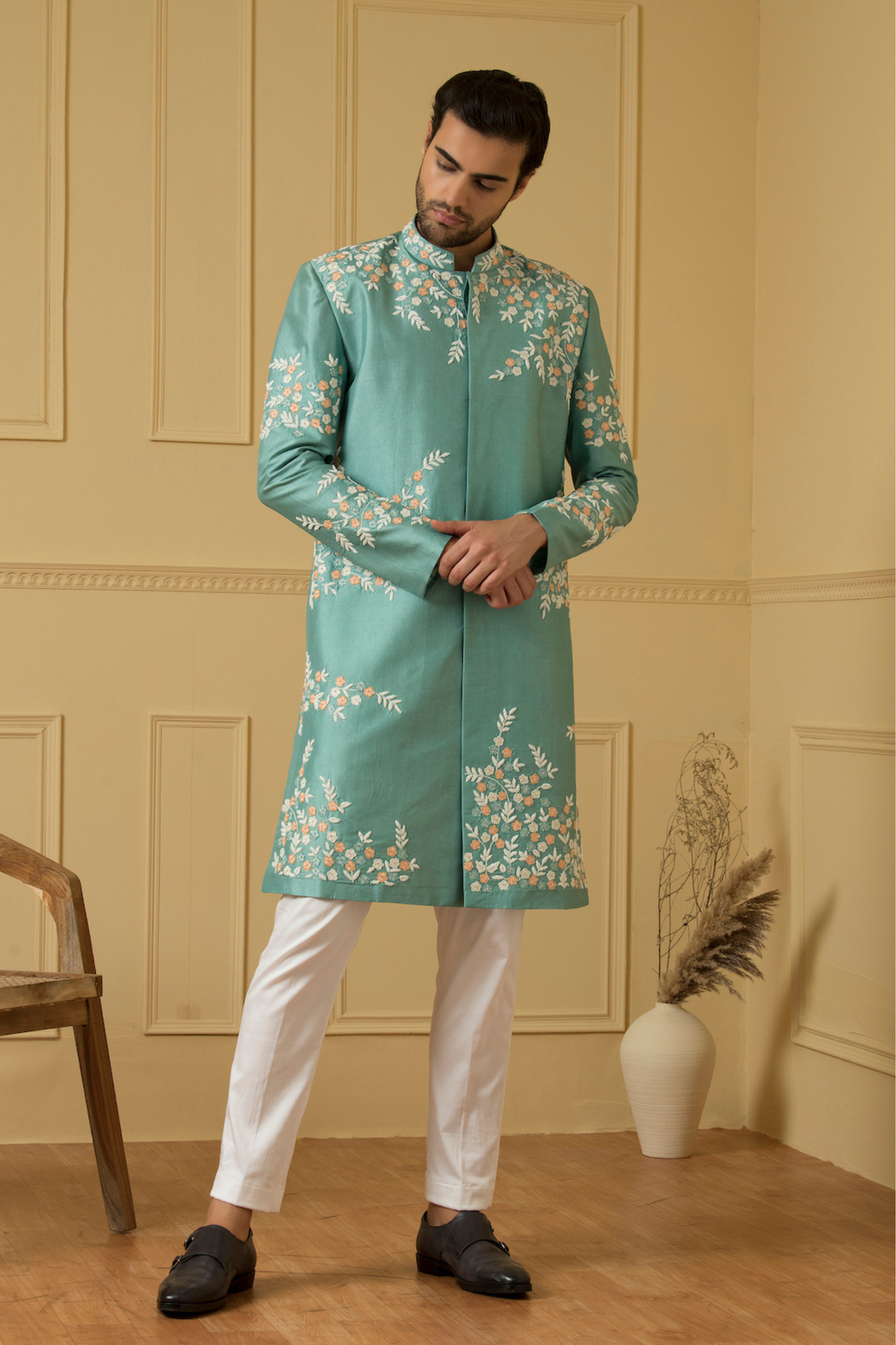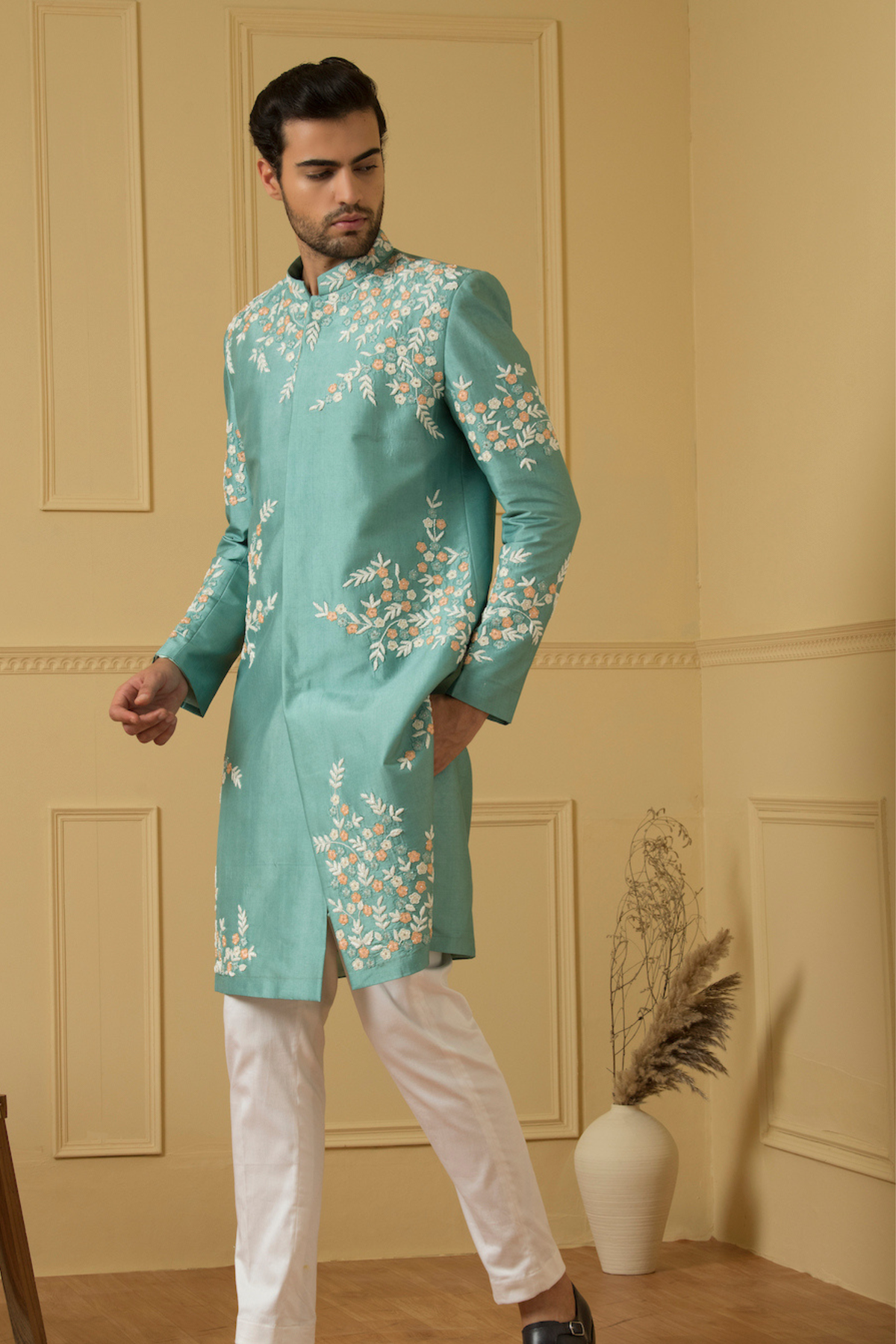 Sea blue sherwani with multi-colored hand embroidery made of dupion silk. Features peach, white, and sea green cut beads. Custom-made and tailored based on body measurements for a royal and luxurious feel with utmost comfort.