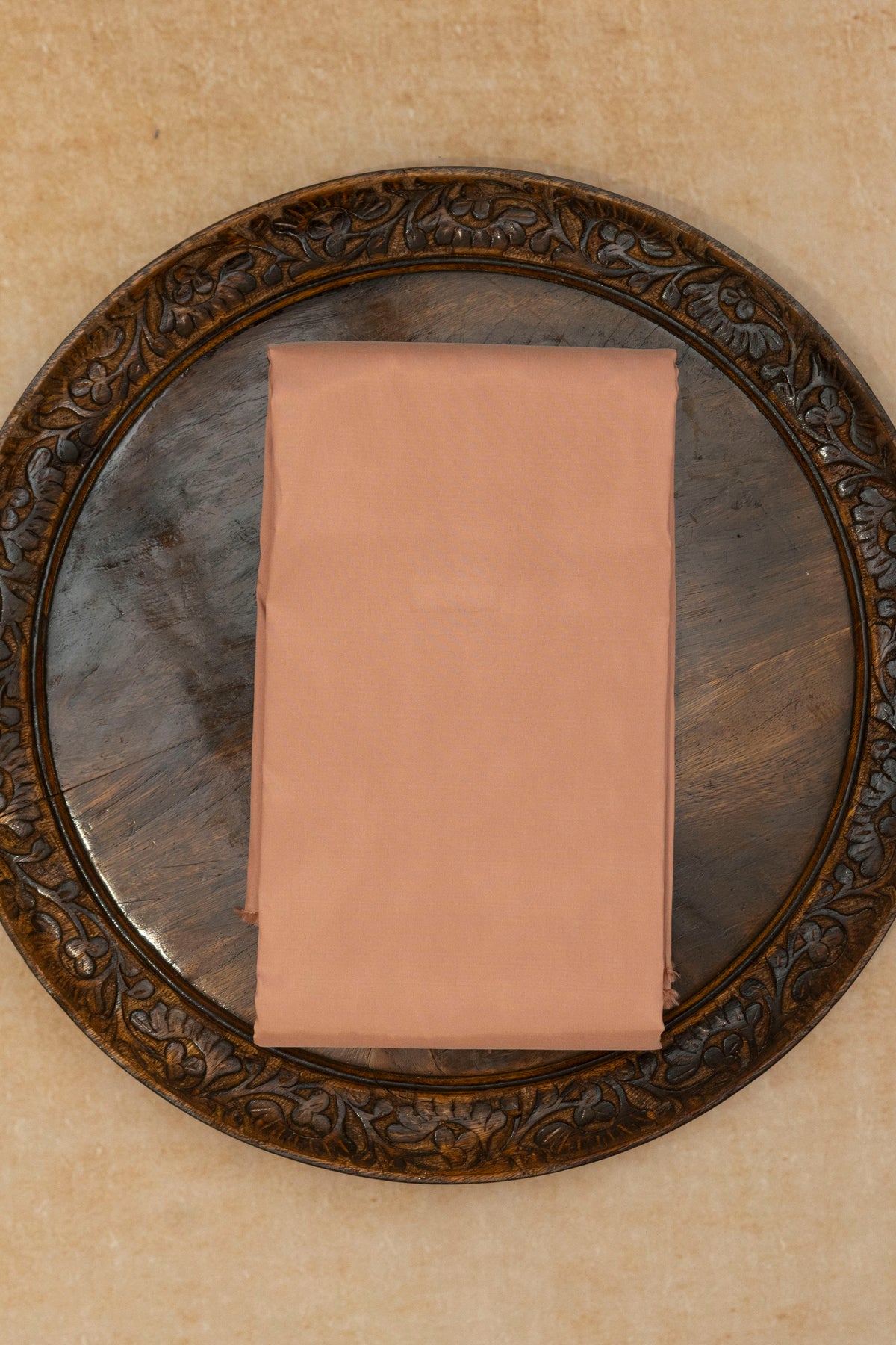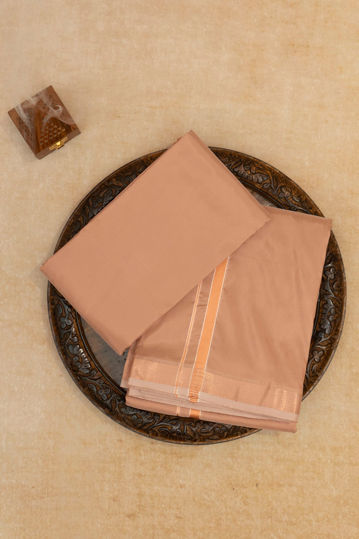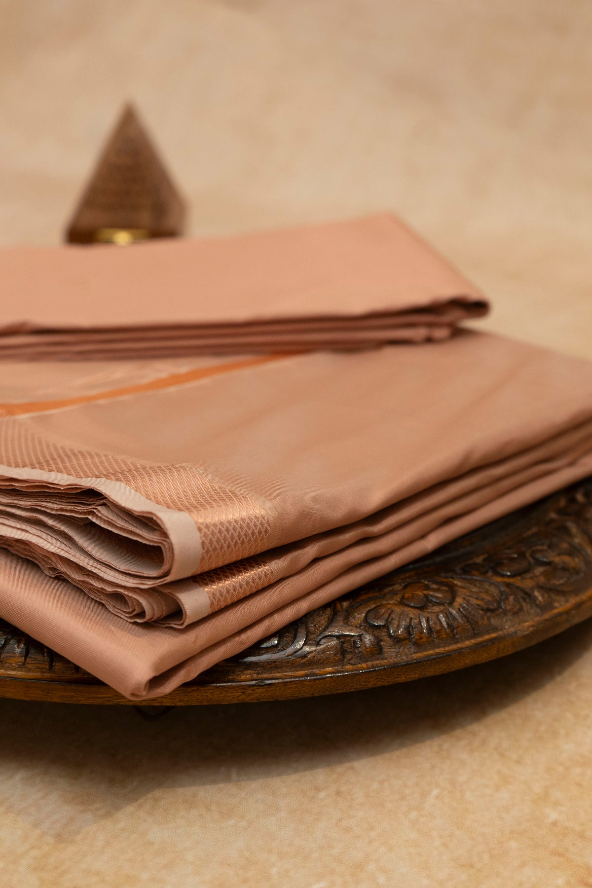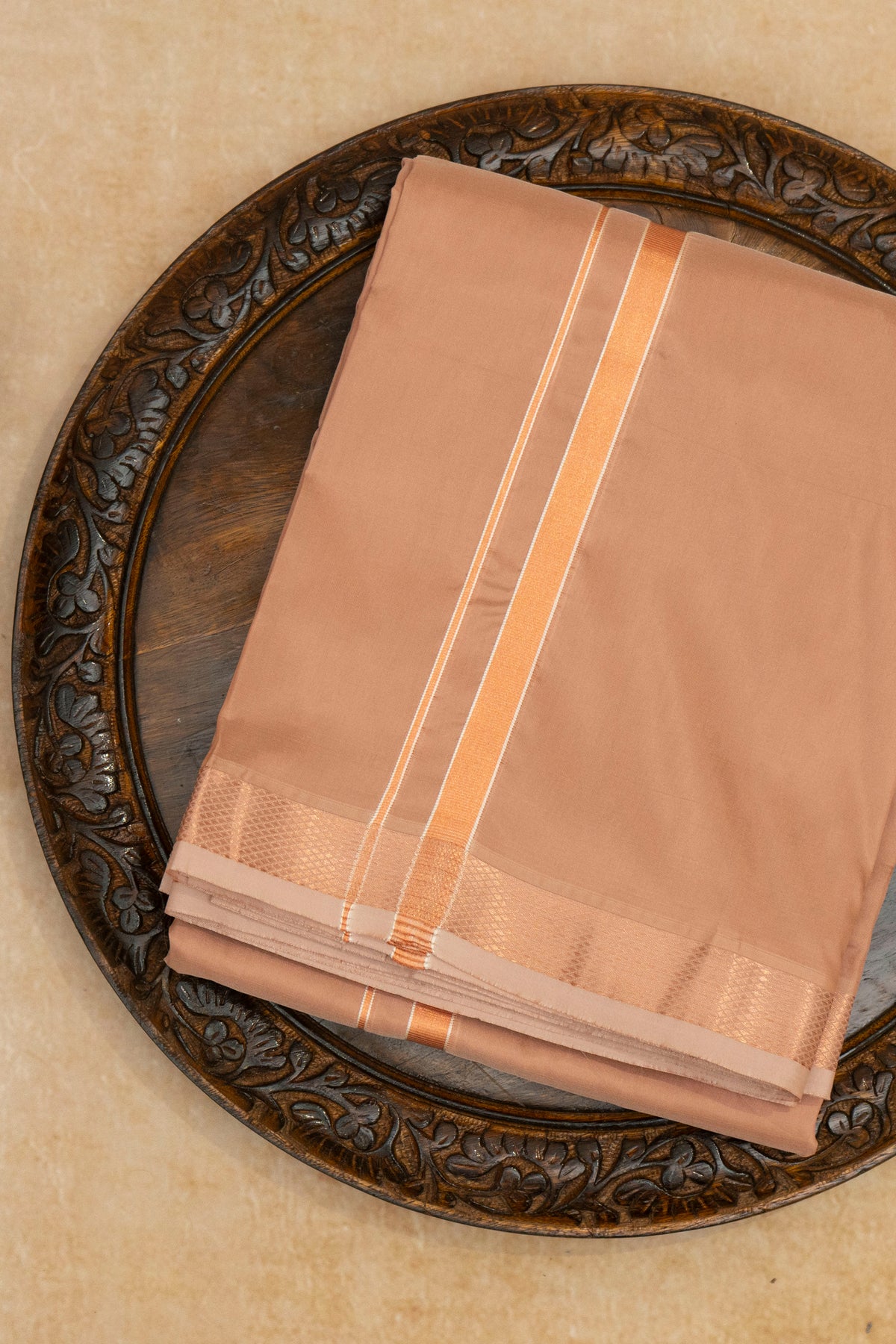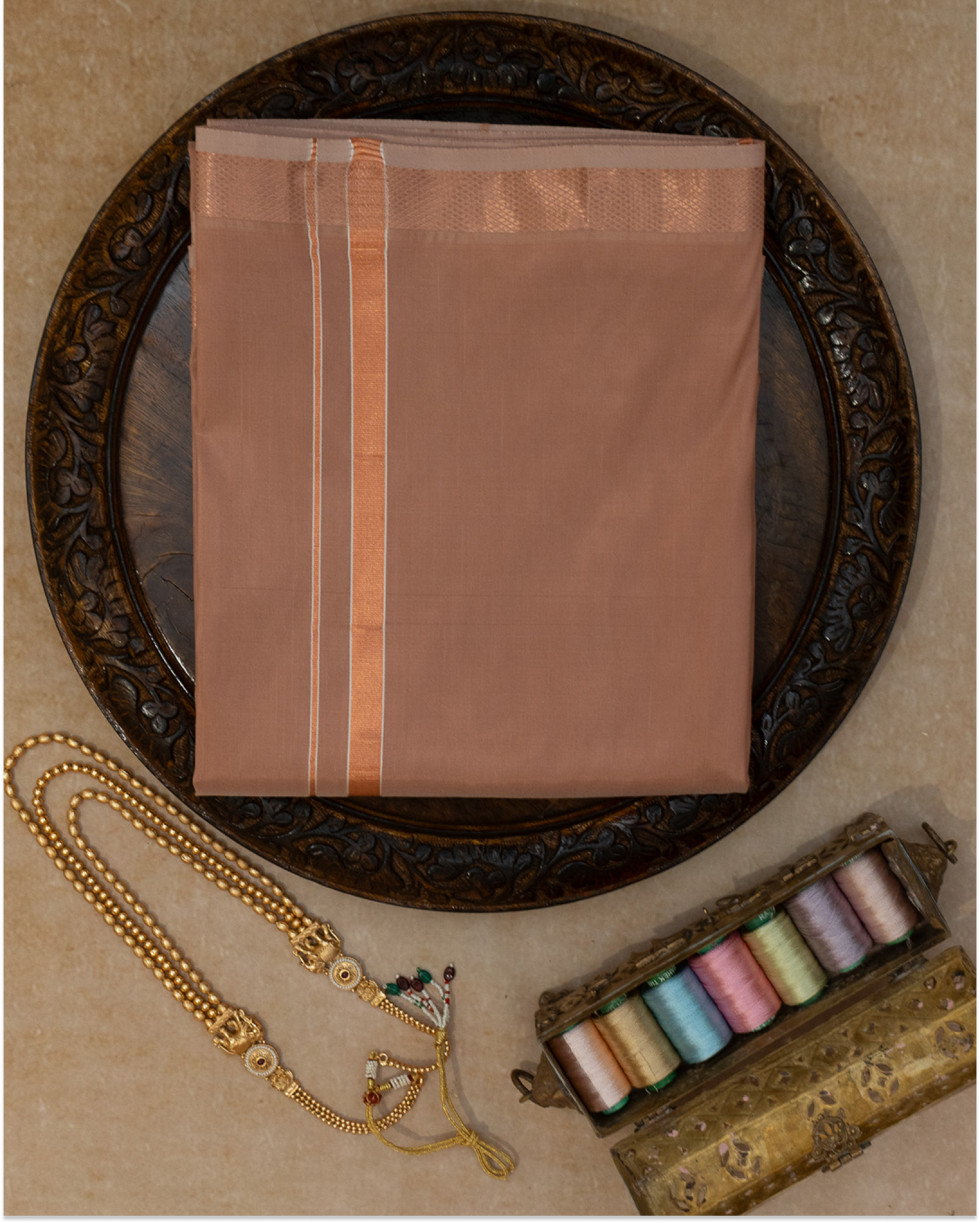 DESCRIPTION : Kanaka is a serene and youthful peach-nude fine-silk fabric crafted for those who appreciate soft elegance and authentic South Indian detailing. Its smooth, lightweight drape and gentle natural sheen give it a premium traditional look.The fabric is beautifully accented with a copper-gold zari strip, accompanied by delicate twin ivory lines that add subtle refinement and cultural charm. Completing the design is a textured copper zari border, offering a soft metallic shine perfect for festive, ceremonial, and ethnic menswear creations.