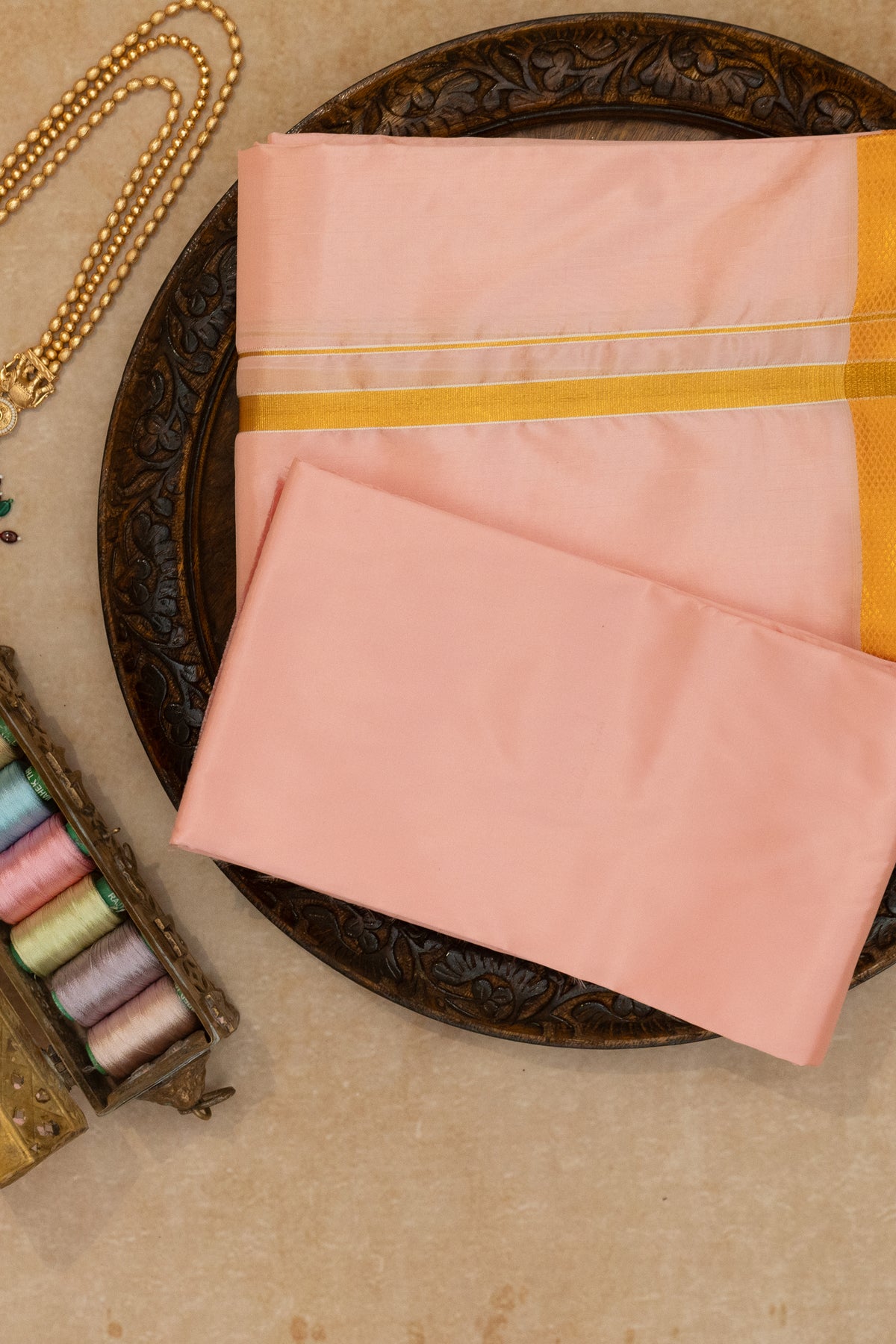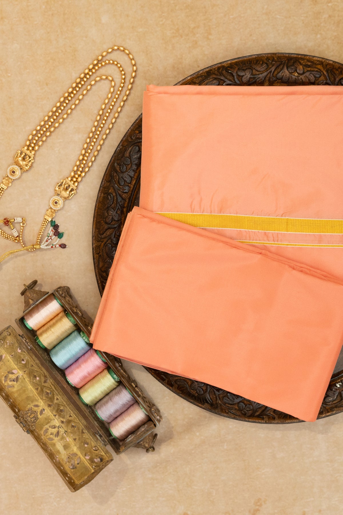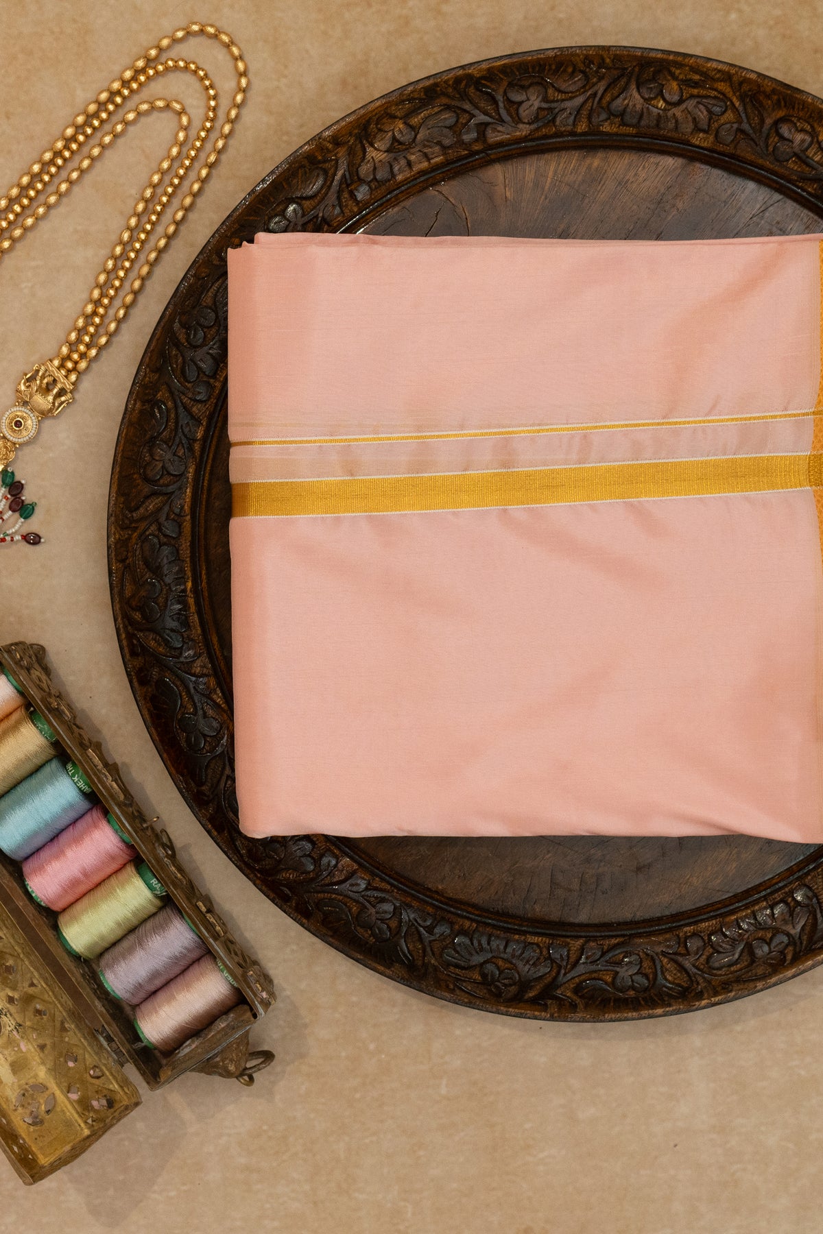 DESCRIPTION : Madhuvarna is a luxurious honey-beige fine silk fabric inspired by the grace and heritage of classic Telugu–Tamil traditional wear. Its warm, honeyed tone paired with a soft natural sheen gives it a regal yet understated elegance.The fabric is beautifully accented with a glowing fine gold zari border, adding a touch of festive radiance without overwhelming its serene charm. Lightweight, smooth, and versatile, Madhuvarna is ideal for dhotis, saree borders, ethnic menswear, and ceremonial couture.