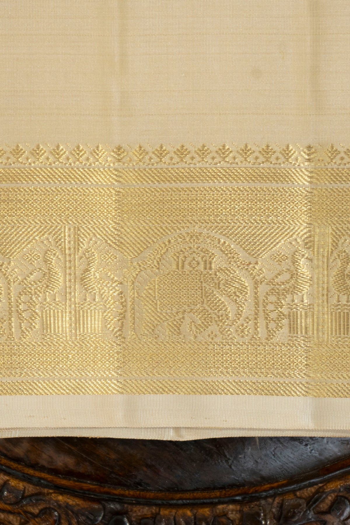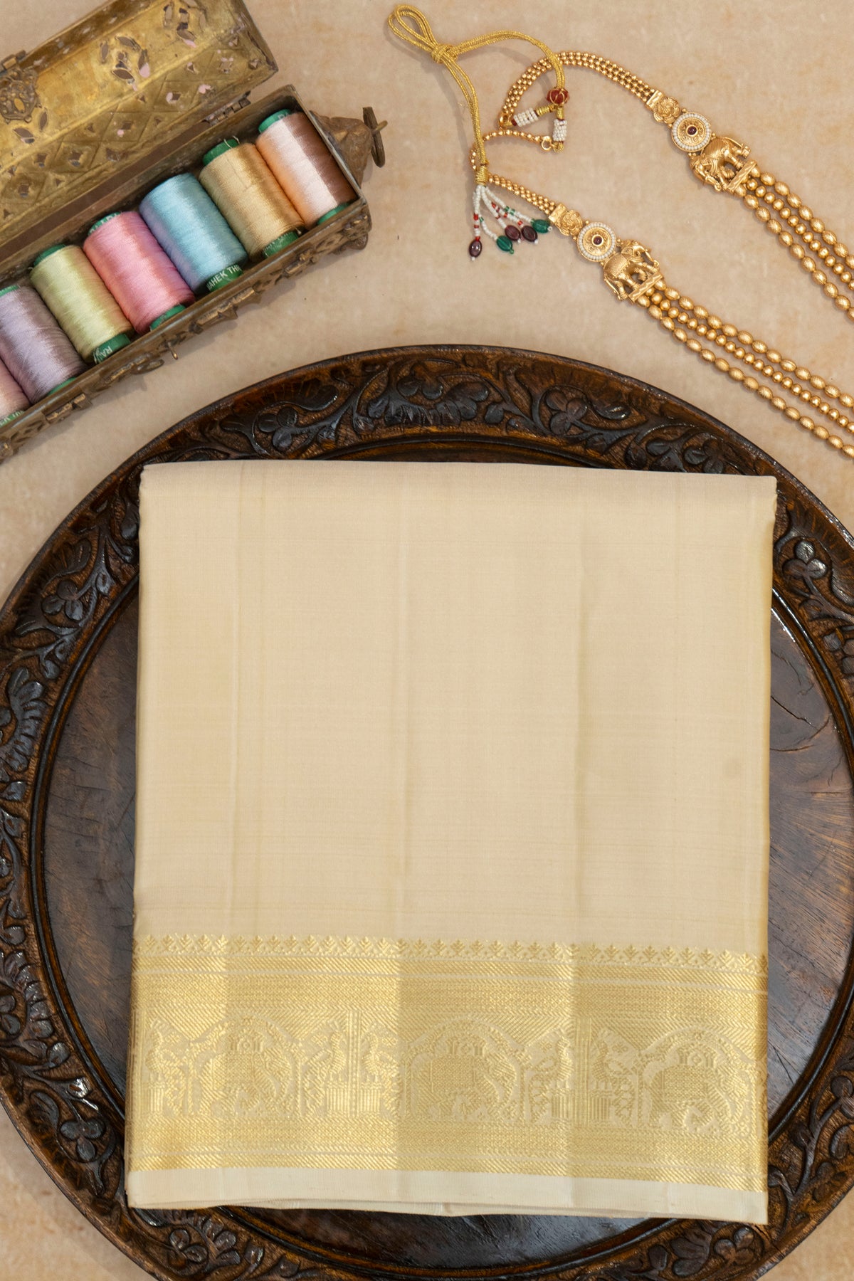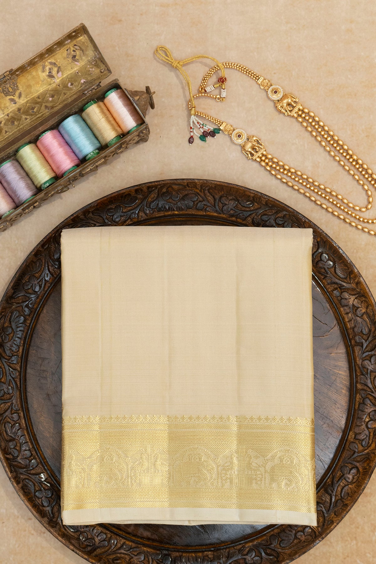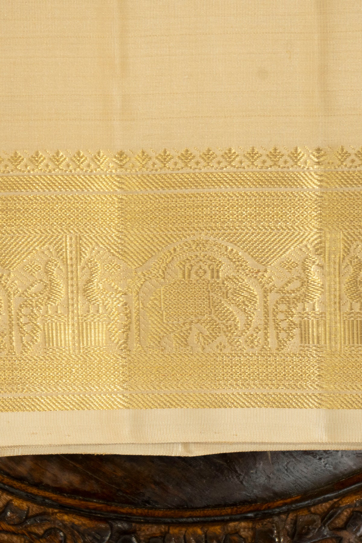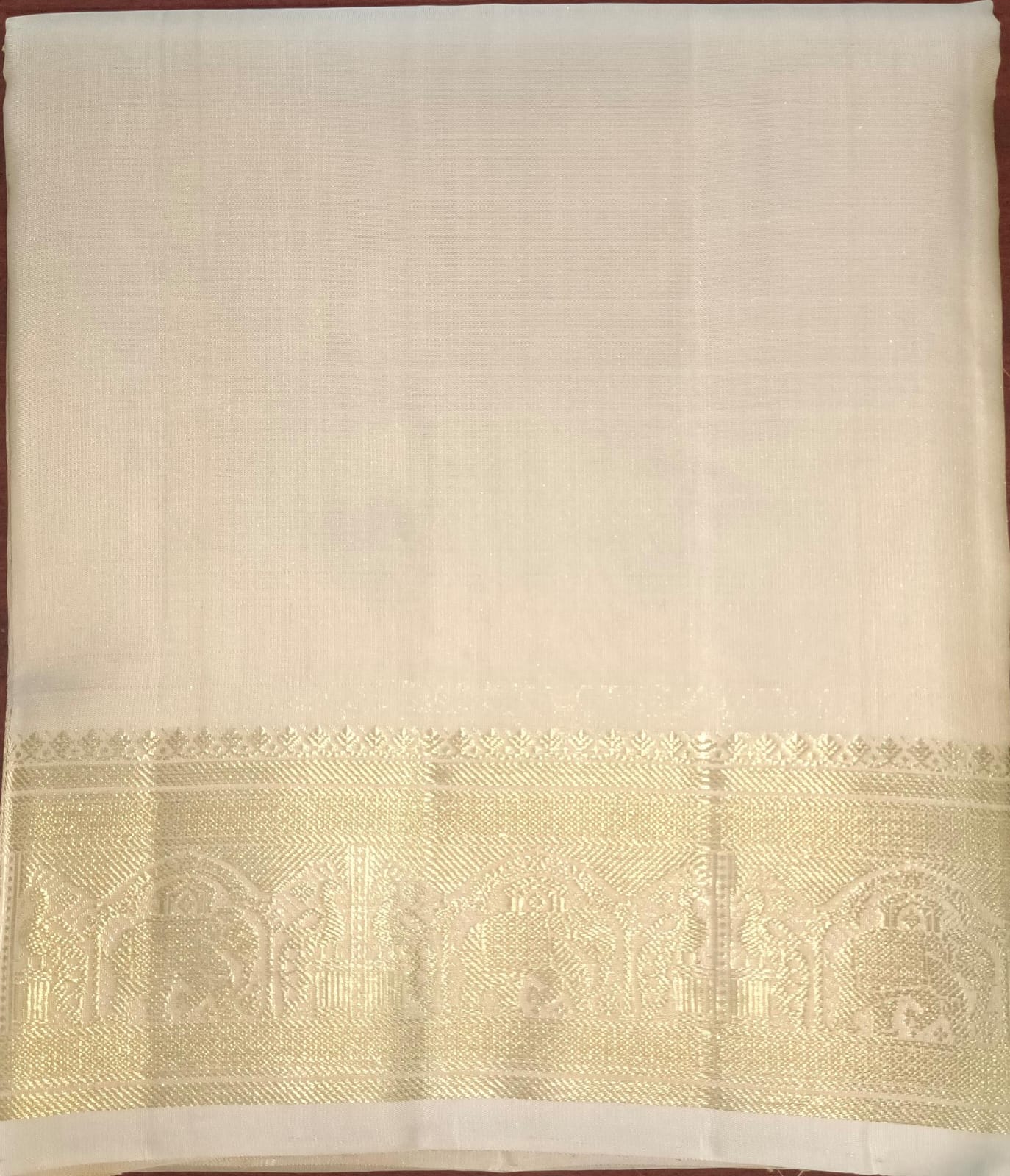 DESCRIPTION : Elegant cream Kanjivaram pattu dhoti featuring an intricately woven gold zari border with traditional temple motifs, offering a rich and graceful festive look