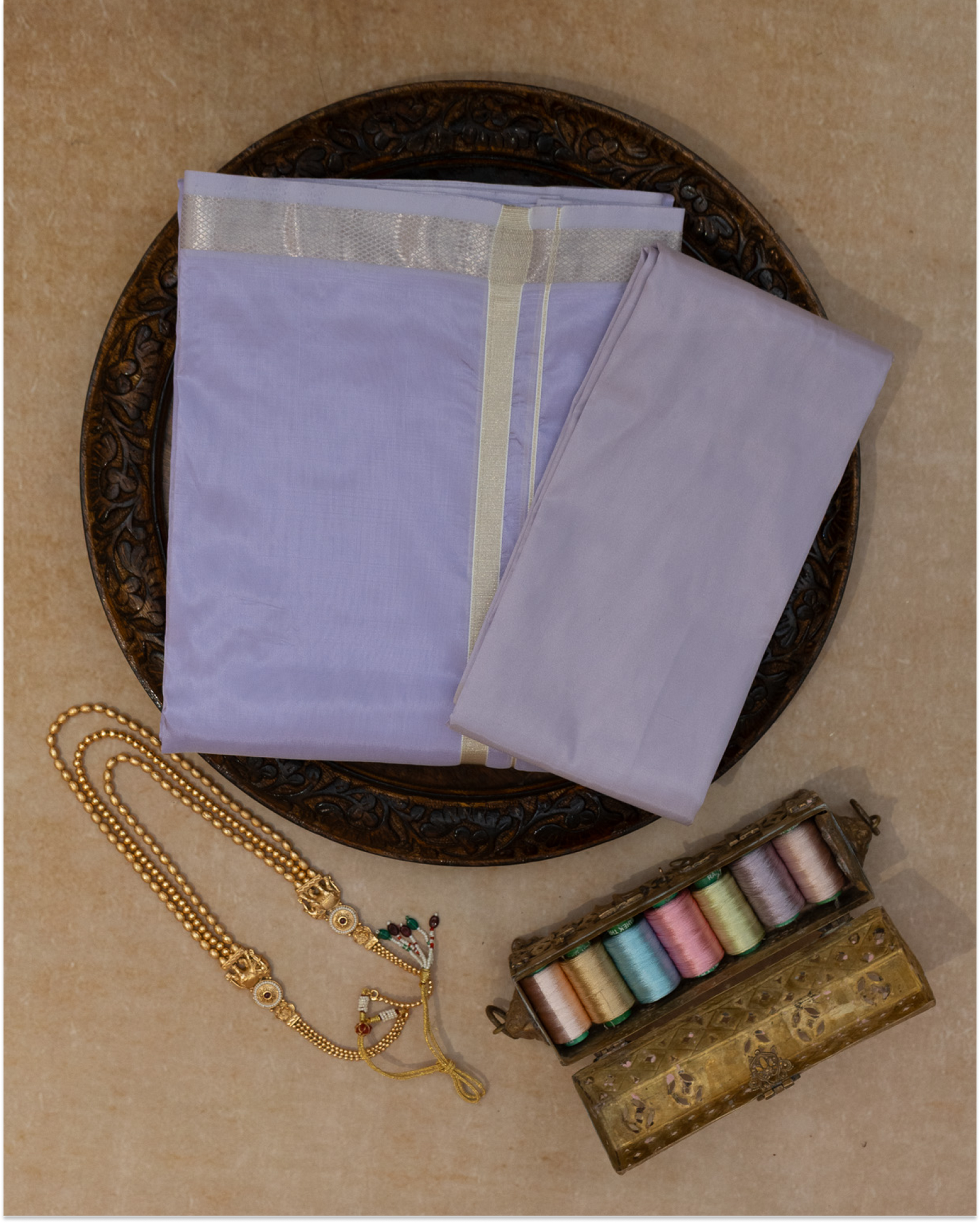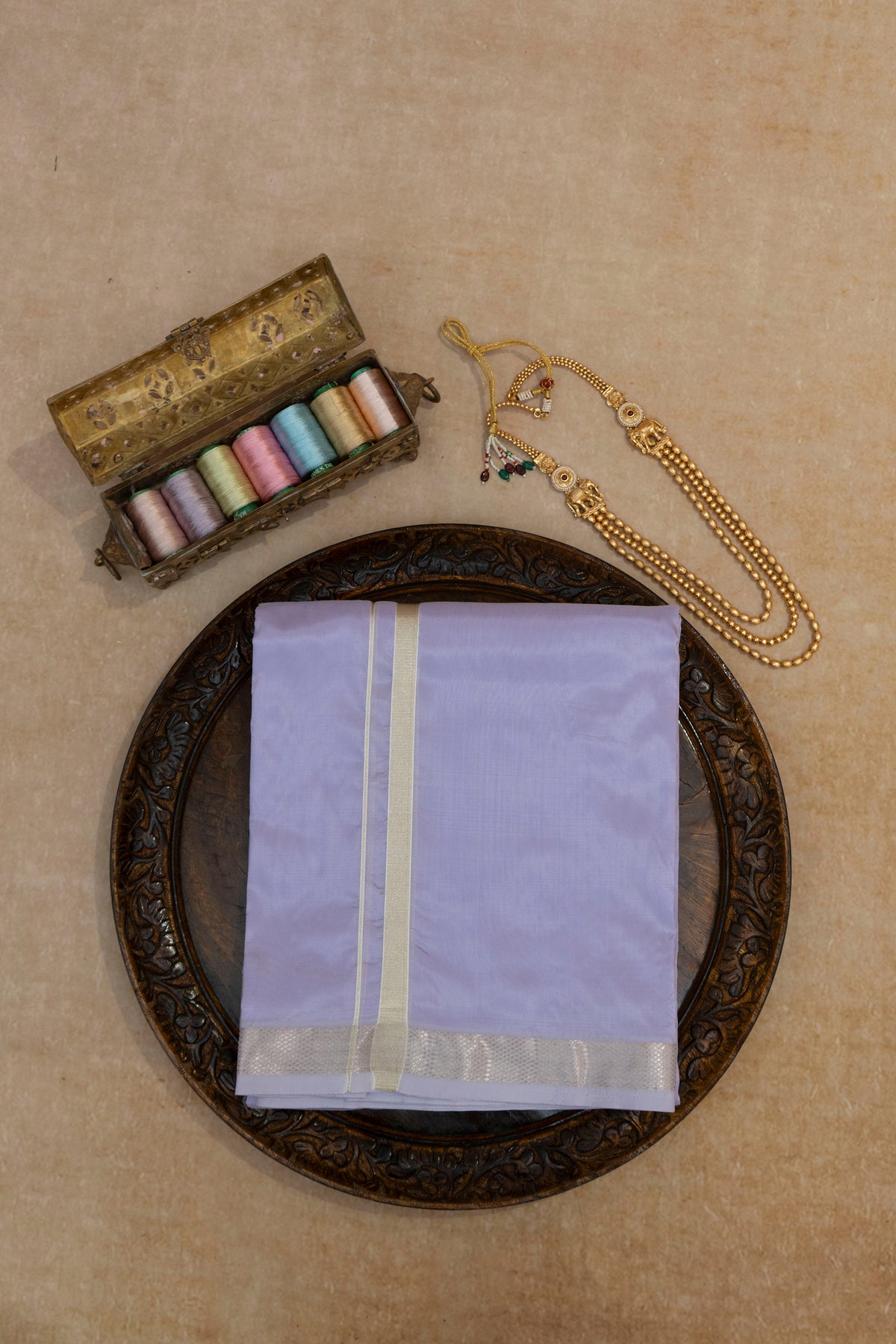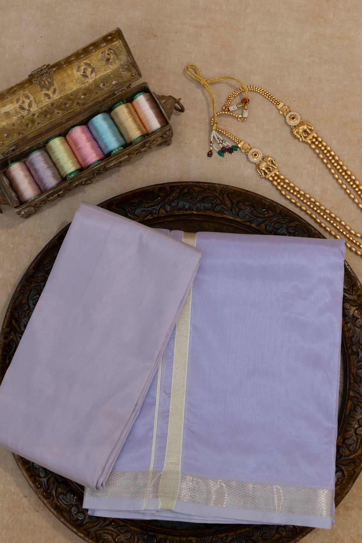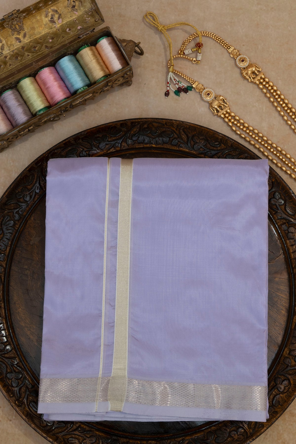 DESCRIPTION : Mahira is an elegant muted lilac fine-silk fabric crafted for those who appreciate subtle luxury and timeless festive charm. Its soft, pastel tone is enhanced by a gentle natural sheen, giving the fabric a serene and refined appearance.Finished with radiant zari detailing, Mahira strikes the perfect balance between minimalism and celebration, making it ideal for dhotis, saree borders, ethnic menswear, and contemporary traditional ensembles. Lightweight, smooth, and effortlessly graceful, this fabric brings quiet sophistication to every creation.