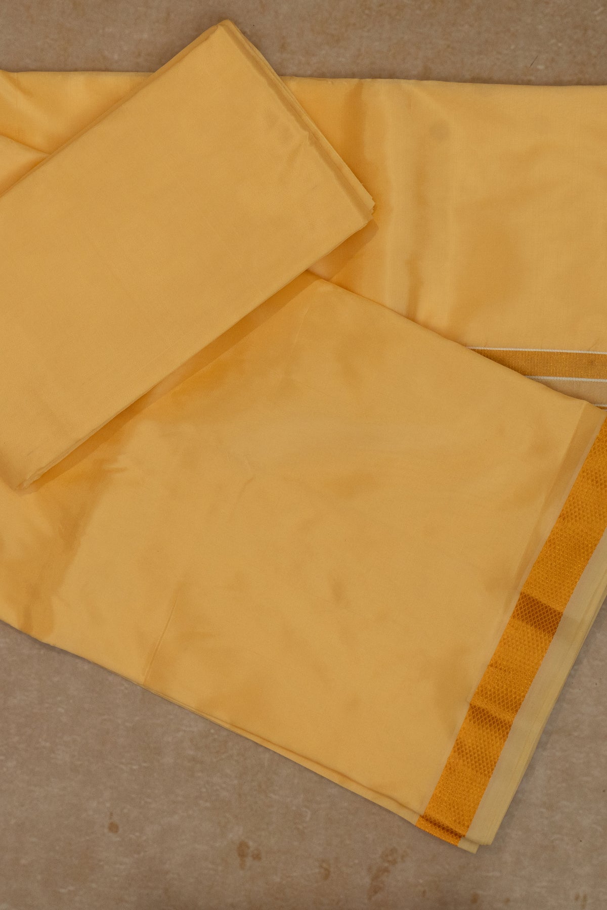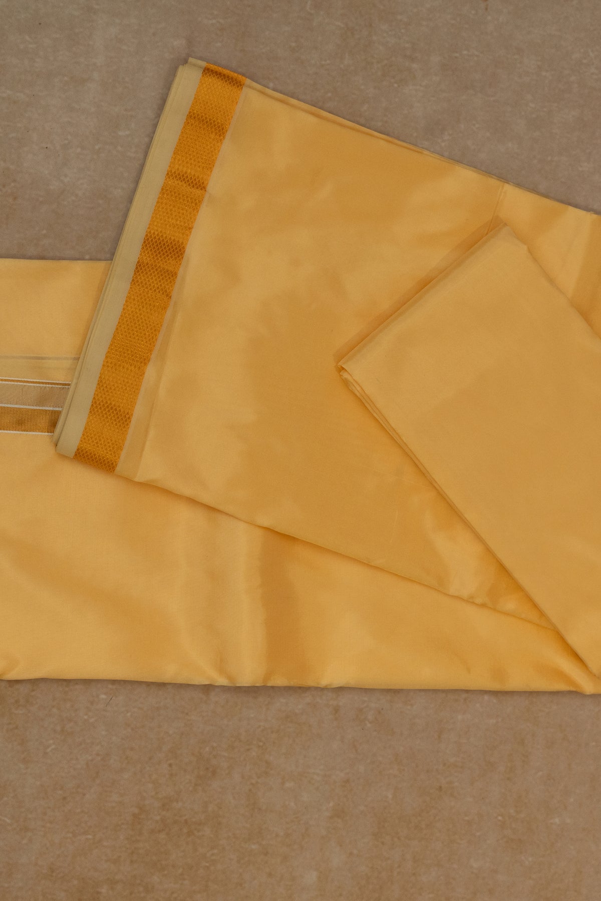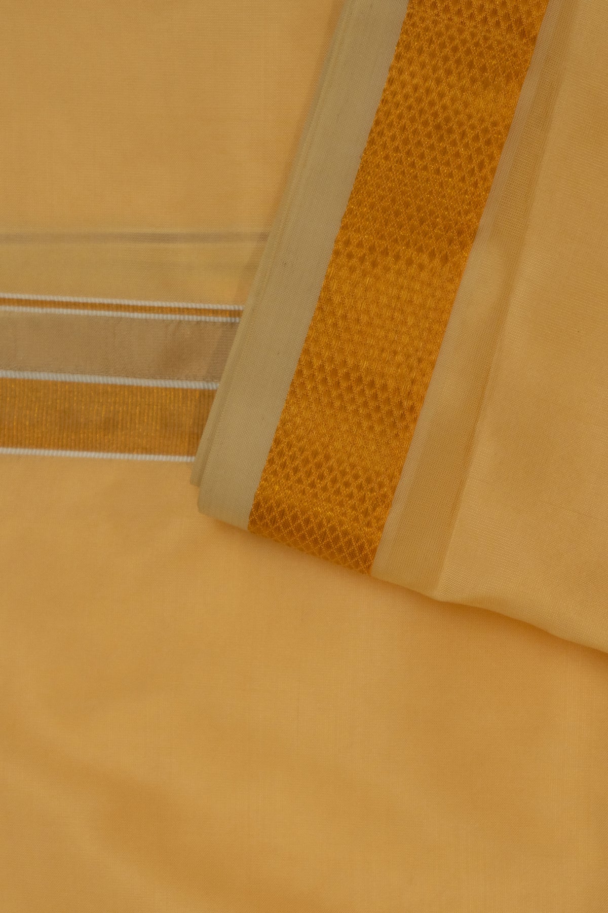 DESCRIPTION : Pravalya is a graceful pale peach fine-silk fabric that blends warmth, tradition, and understated elegance. Its soft, soothing tone is enhanced by a gentle natural sheen, giving it a refined traditional appeal.A yellow-gold zari central line, bordered by neat white liners, adds subtle definition to the fabric, while the mustard-gold jacquard zari lower border introduces a touch of festive brilliance. Together, these details create a harmonious balance of simplicity and cultural richness.