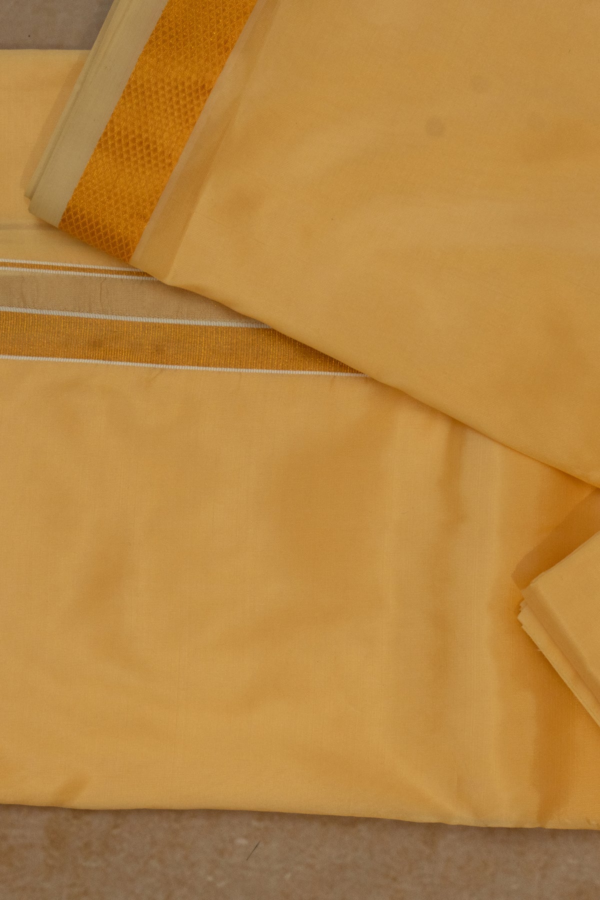FABRIC DECRIPTION : A soft pale peach drape with a warm, traditional feel. The features a yellow-gold zari central line bordered by neat white liners. The lower border showcases a classic mustard-gold jacquard zari, adding brightness and cultural charm.