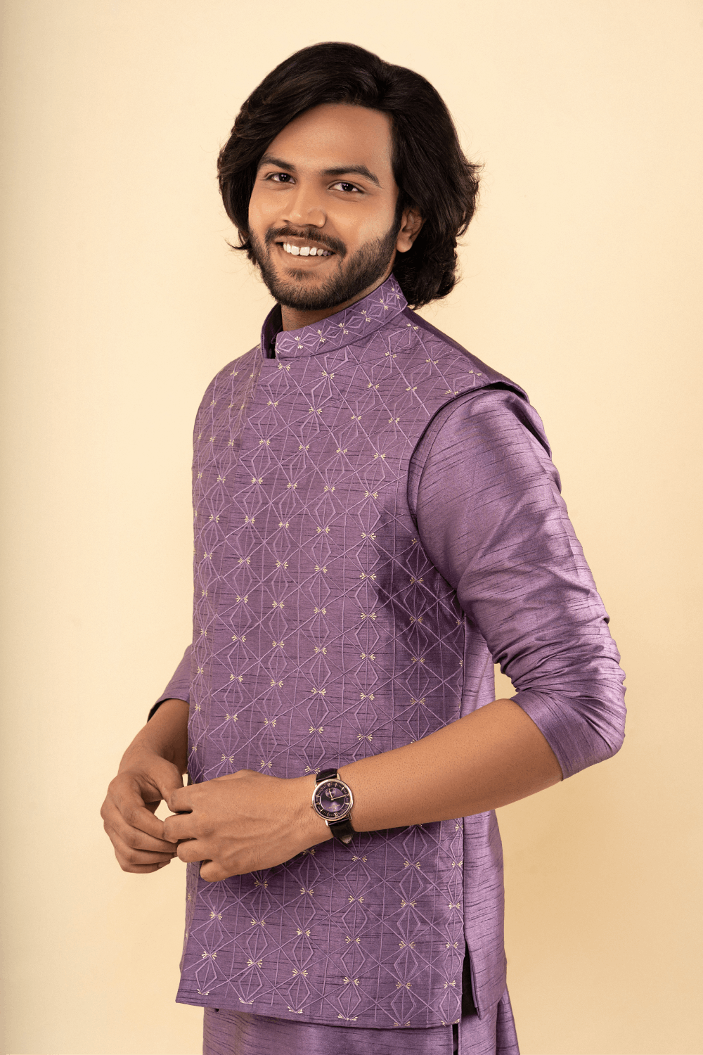 Description: The Mens Nehru Jacket set is the perfect blend of traditional style and modern elegance. Made of semi-raw silk fabric, this jacket is both comfortable and stylish. The purple color is perfect for traditional events, adding a touch of sophistication to your look. The jacket is tailored to fit perfectly, making it easy to wear for any occasion. Whether you're attending a wedding, an anniversary party, or a formal event, this Nehru jacket is sure to make a statement. So why wait? Add this stylish jacket to your wardrobe today! The product comes with a kurta made of Falling Raw silk and a pant which is made of cotton lycra to complete the look.