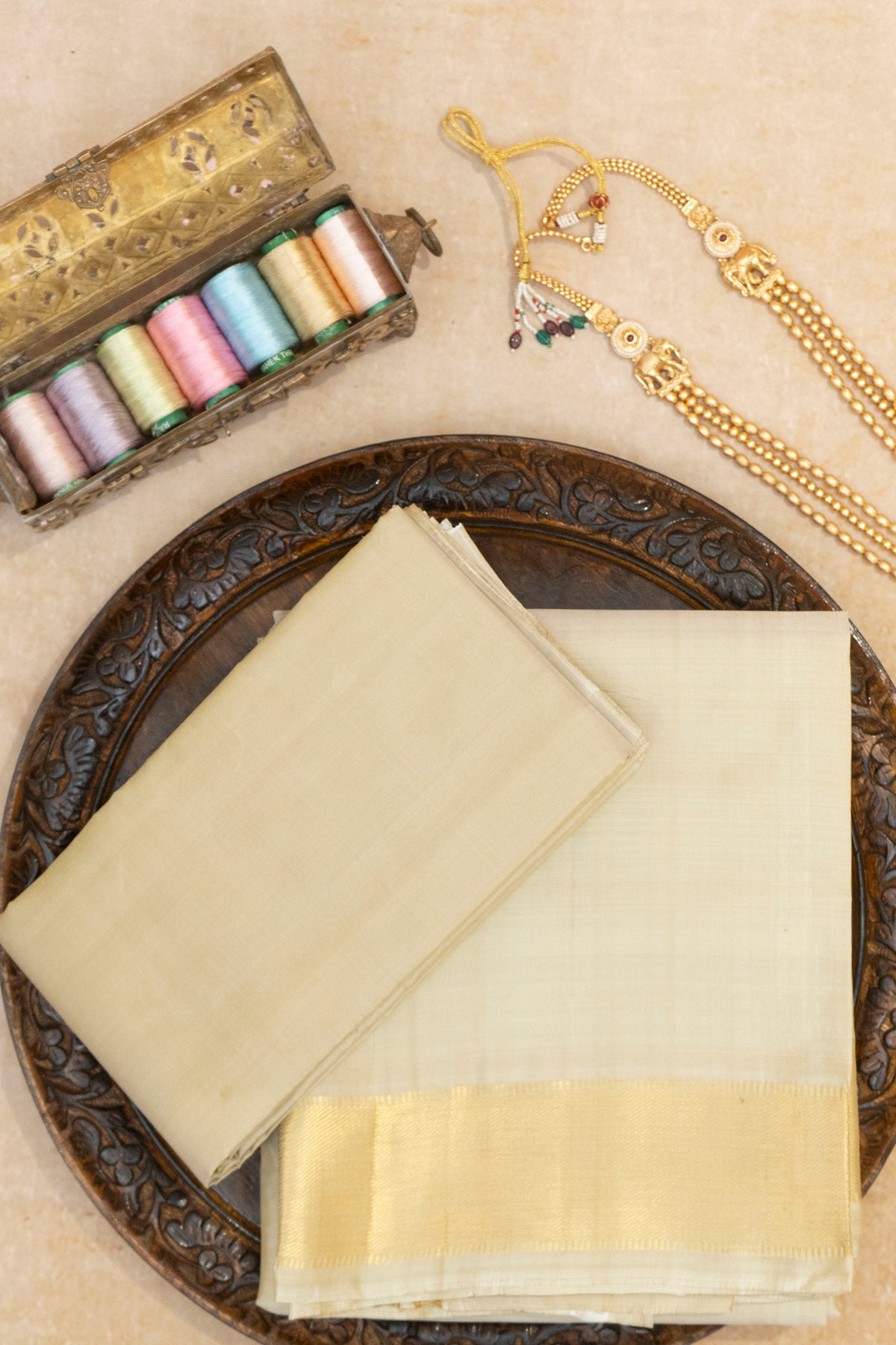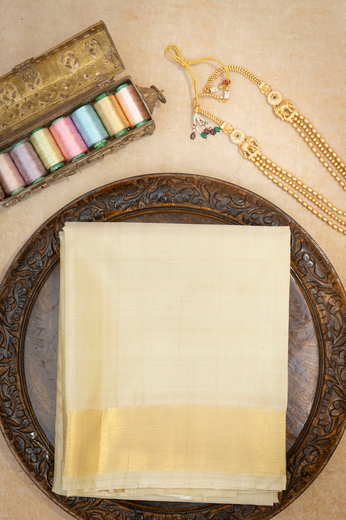 Classic ivory Kanjivaram pattu dhoti with a rich gold zari border, offering a timeless and regal traditional look